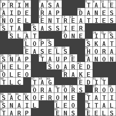 ACROSS 1. Demure 5. White ___ sheet 8. Story 12. Assistant 13. Reproach for some lapse or misdeed 14. Natives or inhabitants of Denmark 15. Christmas carol 16. Pleas 19. R.R. building 20. More lively and spirited 21. Narrow board 23. Single 24. It is 27. Chops off 30. Three-handed card game 31. Artist's stands 34. Israeli folk dance 35. Fastener 38. Grayish beige 40. Soon (poet.) 41. Aid 42. Flew 44. Butter sub 45. Libertine 46. Affectionate concern, for short 47. Label 50. Prepare for publication 53. Speakers 57. Friend of Pooh 59. Italian handbag shop? 63. Jacques of French films 64. Slow-paced one 65. Lion 66. Slanted text style (abbr.) 67. Canvas cover 68. Followers of ems 69. Snakelike fish DOWN 1. Baking dishes 2. Disturbances 3. Standard of perfection 4. Cartoonist voice _ Blanc 5. Type of rug 6. Without 7. Tenement units (abbr.) 8. Make lace 9. Black tropical American cuckoo 10. Area sheltered from the wind 11. Double-curved letter 14. Have the gumption 17. River (Sp.) 18. Car or cant ending 20. Portico 22. City in Syria 24. Image 25. Pacific island yam 26. Comedian Laurel of Laurel & Hardy 28. Pacific Standard Time (abbr.) 29. Oceans 30. Cast a shadow over 32. Nilotic language 33. Practice fight 35. Went for two points 36. 1994 drama film starring Jodie Foster 37. Actor Baldwin 39. Period 43. Makes supply last 47. Utensil 48. Sandy's bark 49. Slender fish 51. Feeling or showing extreme anger 52. Add up to 54. Lacquered or enameled metalware 55. Sign of something about to happen 56. Vintage cars 58. Petroleums 59. Fast jet (abbr.) 60. Santa ___, CA 61. Automobile 62. Monetary unit of Laos 63. Make a knot