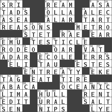 ACROSS 1. Indian title of respect (Mr.) 4. 480, 500 or 516 sheets of paper 8. White ___ sheet 11. Small amounts or degrees 13. Spanish pot 14. Actor Baldwin 15. Toward the sea 16. Having or resembling wings 17. Small pie 18. Thinks logically 21. Paris' subway 22. Proofreading order 23. Actress Charlotte 25. Ewer handle 26. Australian flightless bird 29. One of the two male reproductive glands 32. Cowboy competition 34. Boat paddle 35. Large container 38. The sixth month of the Jewish calendar 39. Learning spot: Fr. 41. Blunders 43. Biblical high priest 44. The 19th letter of the Greek alphabet 45. _____ Park, CO 46. Plea 50. Supplement with great effort 51. Label 54. Erode 55. Hoop that covers a wheel 57. Phillipine bananalike plant 59. Pertaining to the sea 63. Pale green bean 64. Frame or body of a ship 67. Painter Guido (1575-1642) 68. Prepare for publication 69. Mountain range 70. Table seasoning 71. Elected rep. 72. Cuts off 73. Sodium hydroxide DOWN 1. Play the lead 2. Raze (variant) 3. The main thing one is thinking about 4. Cooks with dry heat, as in an oven 5. Pipe bend 6. Chicken ___ king 7. Impair 8. Having winglike extensions 9. Father Junipero _ 10. Thespian 12. Backtalk 14. Had dinner 19. Von Bismarck 20. Born 21. Cartoonist voice _ Blanc 23. Monetary unit of Yemen 24. 1/640 square mile 26. Epoch 27. Method 28. Allodial 30. Woman's close-fitting hat 31. Nights before holidays 33. 4th largest of the Great Lakes 36. Johnson of "Laugh-In" 37. Long journey 39. Singer James 40. Draw slowly or heavily 42. Compass dir. 45. Jane of fiction 47. Teachers' org. 48. Ringlike coral islands and reefs 49. Nervous spasm 51. Lies 52. Stay 53. Homeless child 56. Hearing organs 58. Feline 60. Actress Patricia 61. In an inward manner 62. Quote 64. Attila the _ 65. RI univ. 66. Pet locale