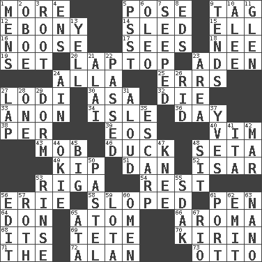 ACROSS 1. Greater amount 5. Introduce or present, as a question 9. Label 12. Black 14. Downhill vehicle 15. Pipe bend 16. Trap for birds or small mammals 17. Observes 18. Born 19. Arrange properly for use 20. Portable computer 23. Arabian gulf 24. Silent film actress Nazimova 25. Blunders 27. Farming town in central California 30. White ___ sheet 32. Pass on 33. Soon (poet.) 34. Small island 36. 24 hours 38. For each 39. Greek goddess of the dawn 40. Zeal 43. Crowd into 46. Evade 48. Bristle 49. Sleep 51. Daniel's nick name 52. Austrian river, tributary to the Danube 53. Capital of Latvia 54. Remainder 56. 4th largest of the Great Lakes 58. Slanted 61. Writing instrument 64. Spanish title 65. Tiny particle 66. Scent 68. ___ a Wonderful Life 69. False hair 70. Japanese brewing company 71. Definite Article 72. ____ Jay Lerner 73. Von Bismarck DOWN 1. Not women's 2. Mitch Miller's instrument 3. Carrot, for example 4. Followers of ems 5. Inconspicuous attention getter 6. Margarine 7. Oozed 8. Begley and Asner 9. Is inclined (to) 10. Toward shelter 11. Small, secluded valley 13. Shout 21. Jai ____ 22. Went by 23. Type of rug 24. The 18th letter of the Arabic alphabet 26. To free from 27. Infant locale 28. Single 29. Dormintory (informal) 31. Verbally 35. Fortification 37. Jacques Cousteau's middle name 41. Call ___ day 42. Spoil 44. Migrant worker of the '30s 45. Massive 47. Leg joint 48. Be seated 50. Soft color 53. Wash lightly 55. Neighbor of Neb. 56. Prepare for publication 57. Writer of Portnoy's Complaint (1969) 59. Globular water bottle used in Asia 60. Presage 61. Sweet dark-red dessert wine 62. Send forth 63. Billionth: prefix 65. _ moment's notice (2 wds.) 67. _ de Janeiro