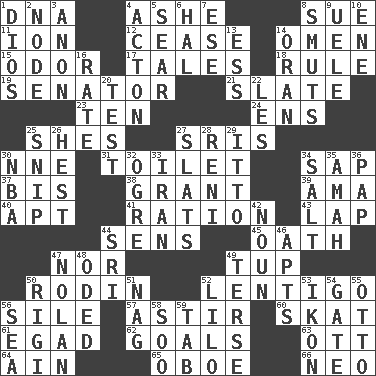 ACROSS 1. Heredity factor (abbr.) 4. American tennis player Robert 8. Institute legal proceedings 11. Electrically charged atom 12. Desist 14. Sign of something about to happen 15. Scent 17. Stories 18. Governing power 19. Elected representative 21. Chalkboard 23. "___ Little Indians" 24. Followers of ems 25. "______ My Girl" (Turtles hit) 27. Indian titles of respect 30. Compass dir. 31. Rest room 34. Plant excrement 37. Twice 38. Let have 39. Nursemaid (var.) 40. Fitting 41. Food allowance for one day 43. Infant locale 44. Elected reps. 45. Pledge 47. Not either 49. Uncastrated adult male sheep 50. "The Thinker" sculptor 52. Small, flat, pigmented spot on the skin 56. Drop; flow; fall 57. Moving about 60. Three-handed card game 61. Mild oath 62. Purposes of endeavors 63. Baseball player Mel 64. The 18th letter of the Arabic alphabet 65. Mitch Miller's instrument 66. Modern: prefix DOWN 1. "Vaya con ____" 2. Connecting point 3. At once, immediately (arch.) 4. Gambison 5. Shrivel 6. Actor Linden 7. Compass dir. 8. Particles of soot 9. Ubangi River tributary 10. Compass dir. 13. Double-curved letter 14. NW Algerian seaport 16. Pace 20. Trial 22. French article 25. Clip 26. Command 27. Narrow boards 28. Painter Guido (1575-1642) 29. "Tell ____ the Marines!" 30. Basketball assoc. 32. Legendary monster 33. SW Asia republic 34. Table seasoning 35. Wet nurse 36. Infant food 42. Part of speech 44. Indian title of respect (Mr.) 46. Flats, for short 47. Pitcher Ryan 48. Wrote a lyric poem 49. Laconic 50. Swiss mountan, "Queen of the Mountains" 51. Tired old horse 52. _ and Stitch 53. Picture 54. Yard entry 55. Von Bismarck 56. Ocean 58. "Barney Miller" actor Jack 59. Keyboard key