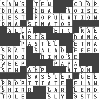 ACROSS 1. Without 5. Nine, plus one 8. Hoof sound 12. Mouths or openings 13. Chief or king in Benin or Nigeria 14. Annoying sound 15. For fear that 16. Census information 19. Heredity factor (abbr.) 20. Elected representative 21. Silent film actress Nazimova 23. And so on (abbr.) 24. Actress Charlotte 27. Ancient Greek god of war 30. Mild oath, euphamism for damn 31. Soft color 34. Inactive volcano in Sicily 35. Three-handed card game 38. First course 40. Nourish 41. Southwest Nigerian state 42. Full of chinks, cracks, or crevices 44. Shed a tear 45. Dad 46. Elected rep. 47. Electrical Unit 50. Tiny particle 53. More impudent 57. Turn to the right 59. Appease 63. Flair 64. Bake eggs in their shells 65. Slender fish 66. Grant temporary use of 67. Lacquered or enameled metalware 68. Insidious 69. Fast planes DOWN 1. Disposed of to a purchaser 2. Sports stadium 3. Relating to the nose 4. Fast jet (abbr.) 5. Drink excessively 6. Inky black, to poets 7. California wine valley 8. Small bed 9. Cards in a Roman deck? 10. Bear (Spanish) 11. Animal enclosure 14. Drug cop 17. Shoshoni 18. Car dealer's back yard 20. "Two Mules for Sister ____" 22. Portable computer 24. Assign a rank or rating to 25. Singer Murray 26. Mild oath 28. Curvy letter 29. Play the lead 30. Outscore 32. Connecticut Ivy Leaguer 33. Desk light 35. Sty mamas 36. Leg joint 37. Arabian gulf 39. ___ good deed 43. Coast Guard woman 47. SW Saudi Arabia district 48. Floor covering 49. 23rd letter of the Greek alphabet 51. Stares 52. Intended 54. Sinks 55. Slanted text style (abbr.) 56. Suggestive of the supernatural 58. Conclusions 59. Pacific Standard Time (abbr.) 60. 17th letter of the Greek alphabet 61. Petroleum 62. Before (prefix) 63. Raised railways