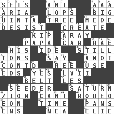 ACROSS 1. Puts into a specified state 5. Cuckoo 8. Auto club (abbr.) 11. Operatic vocal solo 12. Chops off 14. Massive 15. National forest in Provo, Utah 17. Family _ (genealogy) 18. Ancient Persian 19. Cease 21. Make 23. Sleep 25. Like ___ of sunshine 26. Dad 27. 4-wheeled motor vehicle 28. Actress Charlotte 31. Part of HMS, perhaps 33. Binary compound 35. Free from disturbance or agitation 37. Charged atoms 38. Declare 40. Mine, in Marseilles 41. Continued (abbr.) 43. To separate or throw off 45. Purpose 46. Begley and Asner 47. It is so 50. 57 in ancient Rome 52. Waist strap 53. French article 54. Sowing specialist 56. Titan orbits this 61. The Jewish people; Israel 62. Patter 65. Cowboy competition 66. Period of immesurable duration 67. Prong on a fork 68. Baking dishes 69. Followers of ems 70. Teachers' org. 71. Writer Wiesel DOWN 1. Saudi Arabian king (1953-1964) 2. One of the Great Lakes 3. Airtight sealed metal containers 4. Suttee (variant) 5. The first octave above the treble staff 6. And not 7. Medicinal drug used to evoke vomiting 8. Collude with 9. Assistant 10. Personal question 13. Father Junipero _ 16. "____ silly question..." 18. Fifth month 20. Native american tent (variation) 22. Hearing organs 24. Writing tablets 26. Inconspicuous attention getter 28. Basketball hoops 29. Medicinal plant 30. Biblical high priest 31. Parka part 32. Restaurants 34. Ewer handle 36. "Change" in Tahitian 37. Frozen water 39. Shout 42. Colored 44. Nights before holidays 48. Choose 49. Put through a sieve 51. Austrian river, tributary to the Danube 52. Benjamin's nick name 54. The Jewish people; Israel 55. Immeasurably long periods of time 57. Drink excessively 58. Freehold land 59. Painter Guido (1575-1642) 60. Olfactory organ 61. Last letter of the English alphabet 63. Compass dir. 64. Beverage made from leaves