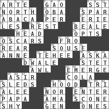 ACROSS 1. Johnson of "Laugh-In" 5. E Mali city 8. Fast jet (abbr.) 11. Compass direction 13. Chief or king in Benin or Nigeria 14. Coast Guard woman 15. Phillipine bananalike plant 16. For each 17. One of the Great Lakes 18. French article 19. State of inaction 21. Calif. Air Force Base 22. Froth on beer 24. Chooses 25. Motion picture awards 27. Away 29. Posterior 30. Lush 32. Queen of England 1702-14 33. Giggle 35. "____ silly question..." 39. A sleeping potion; an opiate (poet.) 41. Proofreading order 42. Leather borer 43. Develop 45. SW Saudi Arabia district 48. Root beer relative 49. Bobsleighs 50. Parka part 52. Three (prefix) 55. Toward shelter 56. Or not 57. Keyboard key 59. Dad 60. Wet nurse (var.) 61. Biscuitlike quick bread 62. Like a shrinking violet 63. Commissioned mil. rank 64. Washington bills DOWN 1. Of or related to the anus 2. Loose flowing garment 3. File 13 4. And so on (abbr.) 5. Republicans 6. Collude with 7. Rowing implement 8. Small fatty European fish 9. Moves on water 10. Woody plant 12. Ethiopian city, capital of Harari 14. Ooze 20. Begley and Asner 21. Expressions of contempt or scorn 23. Having ears or earlike features 25. Mouth or opening 26. Elected rep. 27. Enemy 28. Regret 30. A female animal or person 31. Artist's stand 33. The 23rd letter of the Hebrew alphabet 34. Pipe bend 36. Ski resort town in Vermont 37. Cask 38. Had dinner 40. Armed conflicts 43. Environmental prefix 44. Methods 45. Assad's deity 46. Not well drained, as in land 47. It may be bright or harebrained 49. Plant excrements 50. Residence 51. Northwest Algerian city 53. French philosopher Descartes 54. Angers 56. Tired old horse 58. Non-commissioned officer (abbr.)
