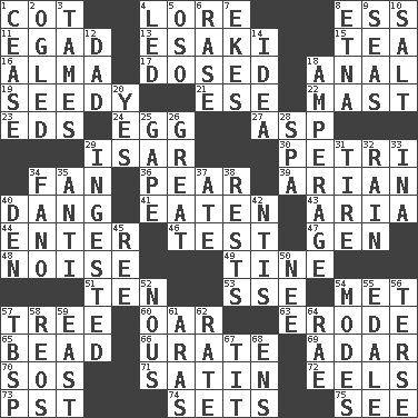 ACROSS 1. Small bed 4. Old wives' tales, e.g. 8. Curvy letter 11. Mild oath 13. 1973 Nobel Price Winner (Physics) Leo 15. Afternoon social gathering 16. _ mater 17. Administered medicine 18. Of or related to the anus 19. Shabby and untidy 21. Compass dir. 22. Vertical spar for supporting sails 23. Begley and Asner 24. Oval reproductive body of a fowl 27. Viper 29. Austrian river, tributary to the Danube 30. _ dish (used to culture cells) 34. Air blower 36. Lightbulb-shaped fruit 39. Believer in; advocate of (suffix) 40. Mild oath, euphamism for damn 41. Ingested 43. Operatic vocal solo 44. Keyboard key 46. Trial 47. Commissioned military rank (abbr.) 48. Annoying sound 49. Prong on a fork 51. "___ Little Indians" 53. Compass dir. 54. Was introduced to 57. Family _ (genealogy) 60. Rowing implement 63. Wear away 65. Necklace unit 66. A salt of uric acid 69. The sixth month of the Jewish calendar 70. Mayday 71. Smooth fabric 72. Snakelike fish 73. Pacific Standard Time (abbr.) 74. Arranges properly for use 75. Observe DOWN 1. Desist 2. Stared at amorously 3. Makes less strong or intense 4. Directed 5. Bear (Spanish) 6. To erase 7. Makes supply last 8. Inactive volcano in Sicily 9. Oceans 10. Table seasoning 12. Male parent 14. It may be bright or harebrained 18. Electrical Measurement 20. Consenting reply 25. Open wide 26. Relatively large 28. Health resort 29. Consumed 31. Hoop that covers a wheel 32. Precipitation 33. _ tizzy (2 wds.) 34. Papal veil 35. Opposed to 37. Had dinner 38. Musical pauses 40. Lair 42. Nuclear Threat Initiatives 45. To separate or throw off 50. Born 52. Good sense 54. Methods 55. Peak District village in England 56. Laconic 57. Cook's measure (abbr.) 58. Vintage cars 59. 90 degrees 61. Caspian sea tributary 62. Pace 64. Actress Charlotte 67. Teat (slang) 68. Followers of ems