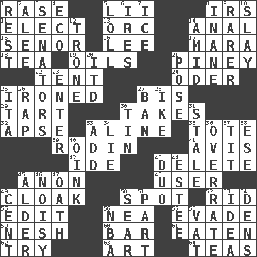 ACROSS 1. To erase 5. Cards in a Roman deck? 8. Big collection agency 11. Opt 13. The grampus (Milton) 14. Of or related to the anus 15. Sir (Sp.) 16. Area sheltered from the wind 17. Hindu Mythology: god of death 18. Beverage made from leaves 19. Lubricates 21. Abounding in pines 22. Portable shelter 24. Baltic tributary 25. Pressed 27. Again 29. Small pie 30. Proceeds 32. Domed church section 33. Place in a line 35. Haul 39. "The Thinker" sculptor 41. Advice 42. Binary compound 43. Erase 45. At once, immediately (arch.) 48. One who makes use of a thing 49. Cover or conceal 50. Blemish 52. To free from 55. Prepare for publication 56. Teachers' org. 57. Elude 59. Delicate 60. Long, evenly shaped piece 61. Eroded 62. Attempt to accomplish something 63. Tate display 64. Afternoon social gatherings DOWN 1. State of inaction 2. Toward shelter 3. Elected representatives 4. Environmental prefix 5. Hang loosely or laxly 6. Angers 7. Frozen water 8. Empty; void 9. More valued for its uncommonness 10. Kill 12. Marketplace scale 14. Among 20. It would 21. Introduce or present, as a question 23. Keyboard key 25. Call ___ day 26. Hit sharply and swiftly 27. Prohibit 28. Mamie's husband 30. Shallow baking pan 31. Having lost freshness 33. Find the sum of 34. Whopper 36. Make much ado about nothing 37. Teat (slang) 38. Compass dir. 40. Pig sound 43. Superhero pair 44. First name in cosmetics 45. Tree or shrub in the Birch family 46. Annoyingly loud 47. Pledge 49. Penny 50. Dry up 51. Component 53. The main thing one is thinking about 54. Hiding places for outlaws 56. Basketball assoc. 58. Large container