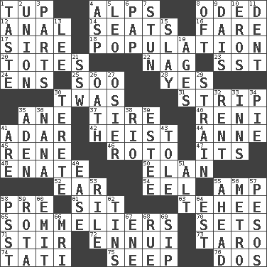 ACROSS 1. Uncastrated adult male sheep 4. High mountains 8. Wrote a lyric poem 12. Of or related to the anus 14. Theater features 16. Conductor's collection 17. Title for a man of rank and authority 18. Census information 20. Lugs 22. Tired old horse 23. Fast jet (abbr.) 24. Followers of ems 25. "Barney Miller" actor Jack 28. Consenting reply 30. It was, poetically 31. Remove all contents or possession from 35. A saturated hydrocarbon 37. Hoop that covers a wheel 40. Painter Guido (1575-1642) 41. The sixth month of the Jewish calendar 42. Robbery 44. Singer Murray 45. French philosopher Descartes 46. Printing process, for short 47. It is 48. Related on the mother's side 50. Liveliness 52. Ewer handle 54. Snakelike fish 55. Electrical Unit 58. Before (prefix) 61. Be seated 63. Giggle 65. Wine waiters 70. Puts into a specified state 71. Agitate 72. World-weariness 73. Pacific island yam 74. Jacques of French films 75. Ooze 76. Two (Sp.) DOWN 1. Clothes sense 2. The state of being joined or united 3. Actors' quests 4. Viper 5. Lion 6. Infant food 7. Surprise greatly 8. Often (poetically) 9. Raised platform 10. Greek god of love 11. Scratch 13. Area sheltered from the wind 15. Kill 19. Grows older 21. Compass dir. 26. Pledge 27. Flexible twig of a willow tree 29. Put through a sieve 30. Cigar-shaped 32. Monthly bill 33. Lodging establishments 34. Sliced dessert 35. An important port of Yemen 36. Nanny 38. _ de Janeiro 39. First name in cosmetics 41. "We ___ not amused" (Victoria) 43. Lacquered or enameled metalware 49. Comfort 51. Keyboard modifier key 53. Cause heat under the collar 55. At or in the front 56. Paris' subway 57. Mexican monetary units 58. Inconspicuous attention getter 59. Roll call or roster of names 60. Give off 62. Airtight sealed metal containers 64. Eastern Standard Time (abbr.) 66. Medical imaging device (abbr.) 67. Compass dir. 68. Regret 69. Small drink