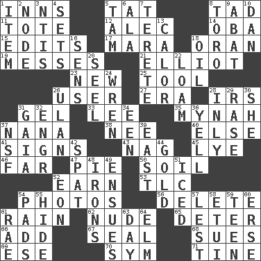 ACROSS 1. Lodging establishments 5. Make lace 8. Bit 11. Lug 12. Actor Baldwin 14. Chief or king in Benin or Nigeria 15. Proofreads 17. Hindu Mythology: god of death 18. NW Algerian seaport 19. Makes clutter 21. American author Paul (1891-1958) 23. ___ Haven, CT 25. Utensil 26. One who makes use of a thing 27. Epoch 28. Big collection agency 31. Set 33. Area sheltered from the wind 35. Non-adult bird? 37. Grandmother 38. Born 40. Otherwise 41. Signals 43. Tired old horse 45. Potassium hydroxide 46. At a great distance 47. Sliced dessert 50. Land 52. Merit 53. Affectionate concern, for short 54. Pictures 56. Keyboard key 61. Precipitation 62. Unadorned 65. Prevent from occurring 66. Say or write further 67. Lick closed 68. Takes to court 69. Compass dir. 70. Symbol (abbr.) 71. Prong on a fork DOWN 1. A distinct part 2. Thickened enlargement 3. Nuclear Threat Initiatives 4. Arranges properly for use 5. Scottish cap 6. Chicken ___ king 7. Cylindrical with tapered ends 8. "Corrida" creature 9. Blind as ____ 10. Daniel's nick name 13. Bodily heat indicating an inflammation 16. Elected reps. 18. Lubricate 20. Stitch closed the eyes of (a falcon) 22. Rich soil 24. Songbird 26. Uhlan (variant) 28. Inwardly 29. Raze (variant) 30. A female animal or person 31. Greek goddess of the earth (variant) 32. Engineer (abbr.) 34. Car or cant ending 36. Shout 37. Science/research agcy. 39. Compass direction 42. Argument over a trivial matter 44. Gilt 48. Removes the wrinkles 49. Follows as a consequence or result 51. On the rocks 52. A really long time 54. Groovy apts. 55. Flintstone garb 57. For fear that 58. Needle case 59. Adolescent 60. Celtic language 61. Actress Charlotte 63. 24 hours 64. Shade tree