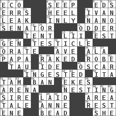 ACROSS 1. Environmental prefix 4. Ooze 8. Begley and Asner 11. Blunders 13. Person who is morally reprehensible 14. "Terrible" tsar 15. Path through which fluid escapes 16. Inwardly 17. Billionth: prefix 18. Elected representative 21. More peculiar 22. Portable shelter 23. Cards in a Roman deck? 25. Eastern Standard Time (abbr.) 26. Commissioned military rank (abbr.) 29. A testis 32. Speak pompously 34. "___ Maria" 35. Insect wing 38. Dad 39. Moved through 41. Loose flowing garment 43. The 19th letter of the Greek alphabet 44. Binary compound 45. Motion picture award 46. Consumed 50. Call ___ day 51. Scottish cap 54. Prohibit 55. Makes supply last 57. Sports stadium 59. Nestling 63. The founder of a family 64. Put down 67. Length times width 68. Lie 69. Singer Murray 70. Take ten 71. Compass dir. 72. Necklace unit 73. A female animal or person DOWN 1. Snakelike fish 2. Algonquian 3. NW Algerian seaport 4. Upper-body garments 5. Car or cant ending 6. Snakelike fish 7. Apply oneself diligently 8. Dodge 9. Natives or inhabitants of Denmark 10. Derisive sound 12. Three-handed card game 14. Indiana (abbr.) 19. Wig 20. Single 21. Petroleum 23. Moving, as bait 24. On the rocks 26. Republican Party 27. Part of Q.E.F. 28. California wine valley 30. Proceeds 31. Hearing organs 33. "Change" in Tahitian 36. Venues 37. Blind as ____ 39. Port city in Latvia 40. Arabian gulf 42. Period 45. Lyric poems 47. Basketball assoc. 48. Watched over 49. Make supply last 51. Clothes sense 52. Believer in; advocate of (suffix) 53. Haggard of country music 56. Play the lead 58. Born 60. Angers 61. Soft 62. Yard entry 64. Experiment locale 65. A saturated hydrocarbon 66. _ tizzy (2 wds.)