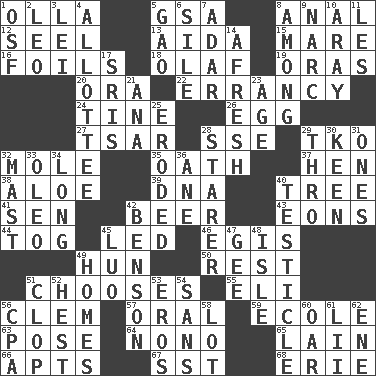 ACROSS 1. Rounded earthenware pot or jar 5. Girls' org. (abbr.) 8. Of or related to the anus 12. Sew up the eyelids of hawks and falcons 13. Opera by Verdi 15. Female horse 16. Fencing necessities 18. Norwegian king 19. Mouths or openings 20. Mouth or opening 22. The state or an instance of erring 24. Prong on a fork 26. Oval reproductive body of a fowl 27. Russian ruler of old 28. Compass dir. 29. Ring climax 32. Undercover agent 35. Pledge 37. Layer 38. _ vera 39. Heredity factor (abbr.) 40. Woody plant 41. Elected rep. 42. Fermented drink made from hops 43. Immeasurably long periods of time 44. Coat; cloak 45. Directed 46. The front part of a cuirass 49. Attila the _ 50. Relief 51. Elects 55. Biblical high priest 56. To starve (Brit.) 57. Relating to the mouth 59. Learning spot: Fr. 63. Airs 64. Words to Nanette 65. (Had) reclined 66. Flats, for short 67. Fast jet (abbr.) 68. 4th largest of the Great Lakes DOWN 1. Order of Saint Francis (abbr.) 2. Lion 3. Flowery wreath 4. One to whom something is allotted 5. E Mali city 6. Filth; sediment 7. The sixth month of the Jewish calendar 8. Amid 9. Drug cop 10. Like ___ of sunshine 11. French article 14. Anew 17. Indian titles of respect 21. Santa ___, CA 23. Mature 25. Eaten away 28. A viewer who gazes fixedly 29. Through, poetically 30. Peachy ____! 31. Singles 32. Vertical spar for supporting sails 33. Butter sub 34. Having great length 36. A saturated hydrocarbon 40. One of the two male reproductive glands 42. Gillaume's butler role 45. Nilotic language 47. Turn to the right 48. Small island 49. Residences 51. Hoof sound 52. Command 53. Greek god of love 54. Without 56. Tax preparer (abbr.) 58. Car dealer's back yard 60. Boat paddle 61. Cards in a Roman deck? 62. Compass dir.