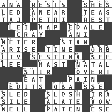 ACROSS 1. Santa ___, CA 4. Musical pauses 9. "______ My Girl" (Turtles hit) 13. Directed 14. Approach 15. Beverages made from leaves 16. _ Mahal 17. _ dish (used to culture cells) 18. State of inaction 19. Luau accessory 21. Atlas unit 22. Peak District village in England 24. Supercomputer manufacturer 26. Black tropical American cuckoo 27. Distance measurement 29. Comedian Laurel of Laurel & Hardy 30. Ascend 31. Prong on a fork 33. Globe 36. 54 in ancient Rome 37. French poetic form 40. Perceive with the eye 41. Area sheltered from the wind 42. Vertical spar for supporting sails 43. Brizilian seaport 45. Move through with a circular motion 47. Unconcealed 48. Consume 49. Ache 50. Prepares for publication 52. Chief or king in Benin or Nigeria 54. Compass dir. 56. Downhill vehicle 57. Splash clumsily 59. Retirement account (abbr.) 61. Drop; flow; fall 62. Having winglike extensions 63. Solemn pledge 64. Not ill 65. Eucharist need 66. Compass dir. DOWN 1. The first octave above the treble staff 2. Anneal 3. Descriptive word 4. Reproach for some lapse or misdeed 5. Foe 6. Bristle 7. Canvas cover 8. _ Lanka 9. Put through a sieve 10. Person who is morally reprehensible 11. Relaxation 12. Fast jet (abbr.) 20. Angers 22. Ingested 23. Heredity factor (abbr.) 25. Ancient Greek god of war 27. Shopping center 28. 4th largest of the Great Lakes 29. In a ____ (agitated or irritated) 31. Russian ruler of old 32. ___ a Wonderful Life 33. Clearly or manifestly demonstrative 34. Tail end 35. Waist strap 38. Gives off 39. Small Philippine buffalo 44. Advice 45. A glass for beer 46. Make lace 49. Thick mixture 50. Writer Wiesel 51. Small valley 52. Rounded earthenware pot or jar 53. Water vessel 55. Greek god of love 56. Compass dir. 57. Plant excrement 58. Layer 60. Deep reverence