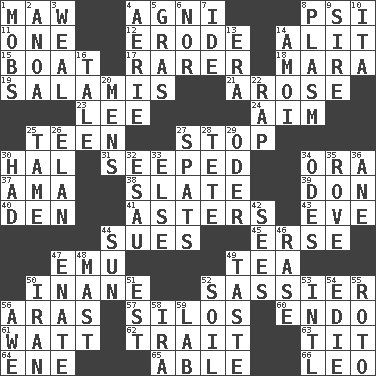 ACROSS 1. Opening into something insatiable 4. Hindu god of fire 8. 23rd letter of the Greek alphabet 11. Single 12. Eat (away) 14. Came down and settled, as after flight 15. Water vessel 17. More valued for its uncommonness 18. Hindu Mythology: god of death 19. Deli grouping 21. Came up 23. Area sheltered from the wind 24. Direct toward a target or goal 25. Adolescent 27. Discontinue 30. Actor Linden 31. Oozed 34. Mouth or opening 37. Housemaid (var.) 38. Chalkboard 39. Spanish title 40. Lair 41. Michaelmas daisies 43. First lady 44. Institutes legal proceedings 45. Celtic language 47. Australian flightless bird 49. Beverage made from leaves 50. Silly 52. More impudent 56. Ancient river in northeast Turkey 57. Grain storage towers 60. Inside; within (prefix) 61. Electrical Unit 62. Distinguishing feature 63. Teat (slang) 64. Compass dir. 65. Competent 66. Lion DOWN 1. Crowds into 2. Small Philippine buffalo 3. Welt 4. Nest on high 5. Pate de foie ____ 6. Not either 7. Binary compound 8. Suffix with ecto or cyto 9. Beget 10. Call ___ day 13. Epoch 14. Mine, in Marseilles 16. Story 20. Not women's 22. Strike 25. Not wild 26. Liveliness 27. Arguments over trivial matters 28. Wig 29. Baltic tributary 30. Possessed 32. He sold his birthright 33. Otherwise 34. Lyric poems 35. Be footloose 36. A saturated hydrocarbon 42. Perceives with the eye 44. Player for Phoenix 46. To erase 47. Maternal 48. Vertical spar for supporting sails 49. Clothes sense 50. SW Asia republic 51. Eastern Standard Time (abbr.) 52. Land 53. International (abbr.) 54. Singer Brickell 55. Printing process, for short 56. Deep reverence 58. Lyricist Gershwin 59. Experiment locale