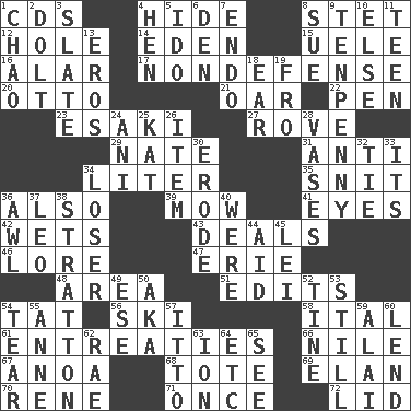ACROSS 1. Music discs 4. Flintstone garb 8. Proofreading order 12. Hollow 14. Paradise 15. Ubangi River tributary 16. Having or resembling wings 17. Unrelated to defense, as in spending 20. Von Bismarck 21. Rowing implement 22. Animal enclosure 23. 1973 Nobel Price Winner (Physics) Leo 27. Be footloose 29. Nathan's nickname 31. Against 34. 61 cubic inches 35. In a ____ (agitated or irritated) 36. In addition 39. Cut the grass 41. Sight organs 42. Soaks 43. Allots cards 46. Old wives' tales, e.g. 47. 4th largest of the Great Lakes 48. Length times width 51. Proofreads 54. Make lace 56. What Jean-Claude Killy likes to do 58. Slanted text style (abbr.) 61. Pleas 66. "Death on the ____" 67. Small Philippine buffalo 68. Lug 69. Enthusiasm 70. French philosopher Descartes 71. At one time in the past 72. Flaplike covering DOWN 1. US Secretary of Labor Elaine L. _ 2. Stupid person 3. Chalkboard 4. Layer 5. Wedding promise 6. Lair 7. Inside; within (prefix) 8. Take to court 9. 3-inch nail 10. Otherwise 11. Adolescent 13. Greek god of love 18. Ewer handle 19. Back 24. Black tropical American cuckoo 25. Krazy ___ of comics 26. Detail 28. Flower holders 30. Wear away 32. Make a knot 33. ___ a Wonderful Life 34. Failure 36. Leather borer 37. Lion 38. Ski resort town in Vermont 40. We are 44. Help 45. Luau accessory 49. Compass dir. 50. Alias (abbr.) 52. Prong on a fork 53. Not moving 54. Pull into pieces 55. Queen of England 1702-14 57. "Tell ____ the Marines!" 59. Jai _ 60. Grant temporary use of 62. Actress Charlotte 63. Electrically charged atom 64. And so on (abbr.) 65. Perceive with the eye