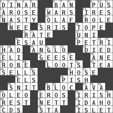 ACROSS 1. Middle Eastern gold or silver currency 6. Prohibit 9. Purulenc 12. Came up 13. Armed conflicts 14. Angers 15. Offensive 16. Norwegian king 17. Hero or heavy, e.g. 18. Born 19. Indian titles of respect 20. Drink excessively 21. Assign a rank or rating to 23. Corn or form start 24. Son of Isaac 25. _ dish (used to culture cells) 28. Possessed 30. White American of non-Hispanic descent 34. Passed on 35. Connecticut Ivy Leaguer 36. Honkers 38. A saturated hydrocarbon 39. Loose flowing garment 41. Plunders 43. Afternoon social gathering 44. Makes a sale 46. Stockings 48. Raised railways 49. Expression of disdain 50. In a ____ (agitated or irritated) 51. Alliance 53. Actress Gardner 56. Butter sub 57. Greek god of love 58. From or relating to Ireland 60. Relief 61. Remaining after all deductions 62. Potato state 63. Music discs 64. R.R. building 65. Small island DOWN 1. One of the 12 tribes of Israel 2. SW Asia republic 3. Olfactory organ 4. Michaelmas daisies 5. Marina Del _, California 6. Indonesian resort city 7. Caspian sea tributary 8. Overdraft (abbr.) 9. Appease 10. Ubangi River tributary 11. Compass dir. 13. Had on 14. Pressed 19. Feeling sharp psychological pain 20. Uncastrated adult male sheep 22. Auto club (abbr.) 24. The property of being fit to eat 26. French philosopher Descartes 27. The main thing one is thinking about 28. Possessive pronoun 29. _ vera 31. Set 32. Lion 33. Bear (Spanish) 37. Principle of right and wrong 40. American author Paul (1891-1958) 42. Distress signal 45. Fast jet (abbr.) 47. Broken pieces 49. Mail 50. Downhill vehicle 51. Cy Young winner Saberhagen 52. Globular water bottle used in Asia 54. Small bottle 55. American tennis player Robert 56. The grampus (Milton) 57. Followers of ems 58. One more than two 59. Being at a high temperature