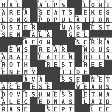 ACROSS 1. Actor Linden 4. High mountains 8. Australian parrot (variant) 12. Length times width 14. Theater features 16. Makes supply last 17. Having great length 18. Census information 20. Flexible twig of a willow tree 22. Tired old horse 23. Eastern Standard Time (abbr.) 24. Elected rep. 25. According to 28. Set 30. A really long time 31. Spanish missionary in California 35. Followers of ems 37. Hitchcock's "____ Window" 40. Common sense 41. Blind as ____ 42. Eroded 44. Rounded earthenware pot or jar 45. Writer of Portnoy's Complaint (1969) 46. Remainder 47. To riddle 48. Foe 50. Event that recurs at intervals 52. Actress Gardner 54. Compass dir. 55. Fish or hair follower 58. Adept person 61. Compass dir. 63. Puts on (as clothing) 65. Innocence, gentleness, or tenderness 70. Inactive volcano in Sicily 71. Actor Baldwin 72. Ferber et al. 73. Put down 74. To erase 75. Back-to-school mo. 76. Area sheltered from the wind DOWN 1. Rings 2. Came up 3. Soviet premier 1918-24 4. Viper 5. Lion 6. Infant food 7. Astound 8. Allow 9. Migrant worker of the '30s 10. Vintage cars 11. Is not 13. Ripen 15. Volcanic refuse 19. Eras 21. Actress Charlotte 26. Old wives' tales, e.g. 27. Approach 29. Poe poem 30. Respiratory problem 32. Hero or heavy, e.g. 33. Governing power 34. White ___ sheet 35. Inky black, to poets 36. Nathan's nickname 38. Had dinner 39. Musical pauses 41. "We ___ not amused" (Victoria) 43. Nuclear Threat Initiatives 49. Jacques Cousteau's middle name 51. Morning condensation 53. American tennis player Robert 55. Relating to or accompanying birth 56. Bert's buddy 57. Sadhe (variant) 58. The sixth month of the Jewish calendar 59. Root beer relative 60. Nights before holidays 62. Extremities 64. Snakelike fish 66. Frozen water 67. Compass dir. 68. Plant excrement 69. Fast jet (abbr.)
