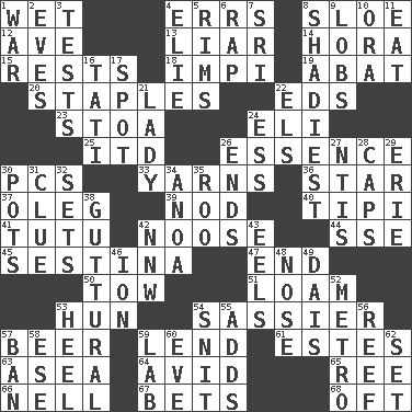 ACROSS 1. Soggy 4. Blunders 8. A type of plum 12. "___ Maria" 13. One who doesn't tell the truth 14. Israeli folk dance 15. Musical pauses 18. Body of Kaffir warriors 19. Blind as ____ 20. Paper fasteners 22. Begley and Asner 23. Portico 24. Connecticut Ivy Leaguer 25. It would 26. Gist 30. Personal Computers (abbr.) 33. Tall tales 36. Play the lead 37. Cassini of fashion 39. Lower and raise head in agreement 40. Native american tent (variation) 41. Ballerina skirt 42. Trap for birds or small mammals 44. Compass dir. 45. French poetic form 47. Conclusion 50. Pull behind 51. Rich soil 53. Attila the _ 54. More impudent 57. Fermented drink made from hops 59. Grant temporary use of 61. _____ Park, CO 63. Toward the sea 64. Enthusiastic 65. To riddle 66. 1994 drama film starring Jodie Foster 67. Antes 68. Often (poetically) DOWN 1. Armed conflict 2. Nights before holidays 3. Trials 4. Writer Wiesel 5. Basketball hoops 6. Reproach for some lapse or misdeed 7. _ Lanka 8. Most questionable 9. Tennis shots 10. Mouth or opening 11. Consume 16. Jacques of French films 17. Specific locale 21. Kenny Rogers chart-topper in '80 22. Raised railways 24. Double-curved letter 26. Conclusions 27. Nuclear Threat Initiatives 28. Balmoral and tarboosh 29. 4th largest of the Great Lakes 30. Cooking vessels 31. A slight indication 32. Arranges properly for use 34. Small Philippine buffalo 35. Friend of Pooh 38. From the throat 42. Compass dir. 43. Snakelike fish 46. Electrically charged atom 48. Characteristic smell of wine 49. Raised platform 52. Paris' subway 53. The bottom of a shoe or boot 54. In a ____ (agitated or irritated) 55. Does sums 56. Coral ridge 57. Bar 58. Compass dir. 59. Experiment locale 60. Night before a holiday 62. Arrange properly for use