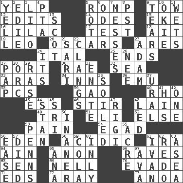 ACROSS 1. Sharp bark 5. Play 9. Pull behind 12. Prepares for publication 14. Lyric poems 15. Supplement with great effort 16. Pale purple color 17. Trial 18. Small island 19. Lion 20. Motion picture awards 23. Ancient Greek god of war 24. Slanted text style (abbr.) 25. Conclusions 27. Left side of a ship or aircraft 30. Actress Charlotte 32. Ocean 33. Ancient river in northeast Turkey 34. Restaurants 36. Australian flightless bird 38. Personal Computers (abbr.) 39. E Mali city 40. 17th letter of the Greek alphabet 43. Double-curved letter 46. Agitate 48. (Had) reclined 49. Three (prefix) 51. Connecticut Ivy Leaguer 52. Otherwise 53. Ache 54. Mild oath 56. Locale of original sin 58. Being or containing an acid 61. Lyricist Gershwin 64. The 18th letter of the Arabic alphabet 65. Soon (poet.) 66. All-night dance parties 68. Elected rep. 69. 1994 drama film starring Jodie Foster 70. Elude 71. Begley and Asner 72. Like ___ of sunshine 73. Small Philippine buffalo DOWN 1. Shout 2. Singer Brickell 3. _ and Stitch 4. Parent Teacher Association (abbr.) 5. Round or rotation of duties 6. River in Europe 7. Makes clutter 8. Pacific Standard Time (abbr.) 9. Rends 10. Migrant worker of the '30s 11. Moistens 13. Native of Scotland 21. Indian skirt 22. Rigngs loudly 23. First man 24. It is 26. Born 27. Infant food 28. The grampus (Milton) 29. To erase 31. Related on the mother's side 35. Dirtied 37. Mountain range 41. Part of HMS, perhaps 42. Single 44. Comedian Laurel of Laurel & Hardy 45. Indian title of respect (Mr.) 47. Swiss mountan, "Queen of the Mountains" 48. Directed 50. More empty; more void 53. Actor Sean's family 55. 1/640 square mile 56. Relaxation 57. Passed on 59. Root beer relative 60. In an inward manner 61. "Terrible" tsar 62. Do over again 63. At sea 65. Santa ___, CA 67. Actress Gardner