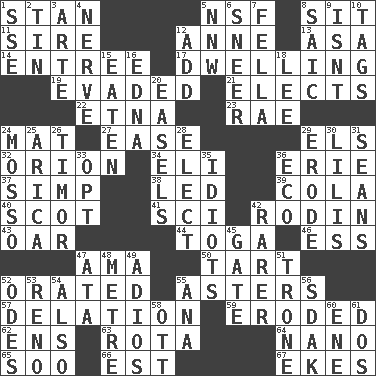 ACROSS 1. Comedian Laurel of Laurel & Hardy 5. Overdraft (abbr.) 8. Be seated 11. The founder of a family 12. Queen of England 1702-14 13. White ___ sheet 14. Main course 17. Home 19. Eluded 21. Opts 22. Inactive volcano in Sicily 23. Actress Charlotte 24. Floor protector 27. Comfort 29. Raised railways 32. Greek mythologigal hunter 34. Connecticut Ivy Leaguer 36. 4th largest of the Great Lakes 37. Simple or foolish person 38. Directed 39. Root beer relative 40. Native of Scotland 41. _-fi 42. "The Thinker" sculptor 43. Boat paddle 44. Ancient Roman robe 46. Double-curved letter 47. Housemaid (var.) 50. Small pie 52. Declaimed 55. Michaelmas daisies 57. Accusation by an informer 59. Eaten away 62. Followers of ems 63. Roll call or roster of names 64. Billionth: prefix 65. "Barney Miller" actor Jack 66. Eastern Standard Time (abbr.) 67. Makes supply last DOWN 1. Compass dir. 2. Shallow baking pan 3. Johnson of "Laugh-In" 4. Impudent aggressiveness 5. Compass dir. 6. Contemptuous expression 7. Man or boy (slang) 8. Ketch in the Levant 9. Is not 10. Labels 12. Say or write further 15. Eroded 16. Pulitzer Prize-winning author Ferber 18. Area sheltered from the wind 20. Artist's stands 24. With motion or animation 25. N. Chile seaport 26. Southeast Indonesia island 28. Choose 29. Wear away 30. Ms. Damita and namesakes 31. Actors Connery and Penn 33. Choose 35. Foolish or stupid persons 36. Environmental prefix 42. More valued for its uncommonness 45. Yard entry 47. "One Day ___ Time" 48. Distance measurement (Brit.) 49. Goodbye (Sp.) 51. Marketplace scale 52. Lyric poems 53. Western Nevada city 54. In addition 55. Santa ___, CA 56. Neighbor of Neb. 58. Baseball player Mel 60. Compass dir. 61. Two (Sp.)