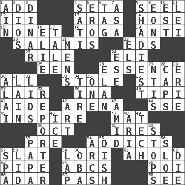 ACROSS 1. Increase 4. Stalk of a moss capsule 8. Sew up the eyelids of hawks and falcons 12. One more than two 13. Caspian sea tributary 14. Flexible conduit 15. Music written for nine 18. Ancient Roman robe 19. Against 20. Deli grouping 22. Begley and Asner 23. Cause heat under the collar 24. Biblical high priest 25. Car or cant ending 26. Center 30. Everything 33. Took without asking 36. Play the lead 37. Den 39. _ tizzy (2 wds.) 40. Native american tent (variation) 41. Assistant 42. Sports stadium 44. Compass dir. 45. Motivate 47. Floor protector 50. Sep. follower 51. Angers 53. Before (prefix) 54. Inveterate users 57. Narrow board 59. Australian parrot (variant) 61. Hold, grip (Informal) 63. Corncob 64. Lettered men learn these first 65. Luau course 66. The sixth month of the Jewish calendar 67. Romantic infatuation 68. Observe DOWN 1. The 18th letter of the Arabic alphabet 2. "Vaya con ____" 3. Middle Eastern gold or silver currency 4. Suttee (variant) 5. Greek god of love 6. Label 7. White ___ sheet 8. Most dark, concealed or hidden 9. Immeasurably long periods of time 10. Eastern Standard Time (abbr.) 11. Flowery wreath 16. Writer Wiesel 17. Story 21. Not women's 22. Raised railways 24. Compass dir. 26. Enthusiasm 27. Nuclear Threat Initiatives 28. Smile enhancers 29. 4th largest of the Great Lakes 30. Jai _ 31. (Had) reclined 32. Flaplike coverings 34. Hoop that covers a wheel 35. Single 38. News announcer 42. Nonscientific branch of learning 43. Among 46. Frozen water 48. Operatic vocal solo 49. Technical 52. Obstructs or blocks passage 53. Dad 54. Curves 55. Food container 56. _ gin 57. Health resort 58. Hat (slang) 59. Infant locale 60. Chief or king in Benin or Nigeria 62. Expire