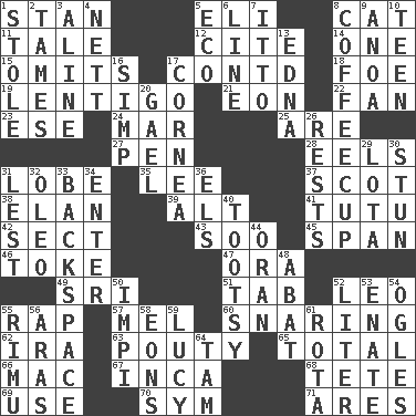 ACROSS 1. Comedian Laurel of Laurel & Hardy 5. Biblical high priest 8. Feline 11. Falsehood 12. Quote 14. Single 15. Leaves out 17. Continued (abbr.) 18. Enemy 19. Small, flat, pigmented spot on the skin 21. A really long time 22. Avid follower 23. Compass dir. 24. Third mo. 25. "We ___ not amused" (Victoria) 27. Fenced enclosure 28. Snakelike fish 31. Ear part 35. Area sheltered from the wind 37. Highlander 38. Flair 39. Keyboard modifier key 41. Ballerina skirt 42. Religious group 43. "Barney Miller" actor Jack 45. Connect, as a bridge 46. Casino tip 47. Mouth or opening 49. Indian title of respect (Mr.) 51. Keyboard key 52. Lion 55. Reproach for some lapse or misdeed 57. Cartoonist voice _ Blanc 60. Catching in a trap 62. Retirement account (abbr.) 63. Marked by pouting 65. "_____ Recall" 66. Big _ 67. South American Indian 68. False hair 69. Purpose 70. Symbol (abbr.) 71. Ancient Greek god of war DOWN 1. Took without asking 2. Domesticates 3. Place in a line 4. Remaining after all deductions 5. Environmental prefix 6. Actor's bit 7. "Tell ____ the Marines!" 8. Java holder (2 wds.) 9. Small Philippine buffalo 10. Adolescent 13. Pulitzer Prize-winning author Ferber 16. Simple or foolish person 17. Pupil covering 20. Highlander 26. Musical pauses 29. Globular water bottle used in Asia 30. Surprise greatly 31. For fear that 32. Butter sub 33. Keyboard key 34. Keyboard key 36. Raised railways 40. A girl or young woman (variant) 44. NW Algerian seaport 48. Blind as ____ 50. Body of Kaffir warriors 52. 61 cubic inches 53. Maternal 54. Stares 55. Tall New Zealand timber tree 56. Ancient river in northeast Turkey 58. Immeasurably long periods of time 59. "I Love _" 61. Round or rotation of duties 64. Scottish cap