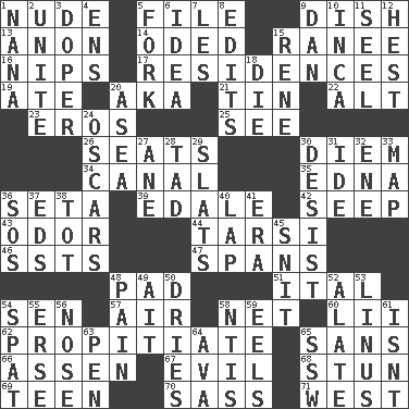 ACROSS 1. Unadorned 5. Do some clerical work 9. Food container 13. At once, immediately (arch.) 14. Wrote a lyric poem 15. Indian princess (variant) 16. Pinches, bites 17. Dwellings 19. Had dinner 20. Alias (abbr.) 21. Metal container 22. The first octave above the treble staff 23. Greek god of love 25. Observe 26. Theater features 30. South Vietnam president (1954) 34. Lessep's creation 35. Pulitzer Prize-winning author Ferber 36. Stalk of a moss capsule 39. Peak District village in England 42. Ooze 43. Aroma 44. Tarsus (plural) 46. Fast planes 47. Connects, as a bridge 48. Groovy apt. 51. Slanted text style (abbr.) 54. Elected rep. 57. Atmosphere 58. Fish or hair follower 60. Cards in a Roman deck? 62. Conciliate 65. Without 66. NE Netherlands city 67. Tending to cause great harm 68. Make senseless or dizzy 69. Adolescent 70. Backtalk 71. 270 degrees DOWN 1. Nanny 2. Join together 3. Drug addict 4. Followers of ems 5. Tined utensil 6. It may be bright or harebrained 7. French article 8. Prepares for publication 9. One of the 12 tribes of Israel 10. South American Indian 11. Stitch closed the eyes of (a falcon) 12. Behest 15. French philosopher Descartes 18. Pass on 20. At sea 24. Motion picture awards 27. One (Scot) 28. Small amount or degree 29. Narrow boards 30. Stop 31. Binary compound 32. Compass dir. 33. Atlas unit 36. Mayday 37. Begley and Asner 38. Small child 40. Infant locale 41. Epoch 45. In a ____ (agitated or irritated) 48. Ache 49. Small island 50. Frees from moisture 52. Having winglike extensions 53. "_ and Lucy" (Charlie Brown theme song) 54. Petty quarrel 55. Celtic language 56. Sense of smell 58. Nuclear Threat Initiatives 59. Snakelike fish 61. Is not 63. Writing instrument 64. Actress Gardner 65. Compass dir.