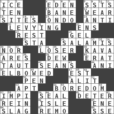 ACROSS 1. Frozen water 4. Paradise 8. Fast planes 12. "___ Little Indians" 13. Object of repulsion 14. Put on (as clothing) 15. Locates 18. Southwest Nigerian state 19. Against 20. Imposing or collecting, as a tax 22. Followers of ems 23. Respite 24. Set 25. R.R. building 26. Deli grouping 30. Or not 33. Failure 36. Polynesian shrub of the pepper family 37. Ancient Greek god of war 39. Morning condensation 40. Part of Q.E.F. 41. Drawn tight 42. Actors Connery and Penn 44. Black tropical American cuckoo 45. Shoved, as through a crowd 47. Eastern Standard Time (abbr.) 50. Animal enclosure 51. Came down and settled, as after flight 53. Fitting 54. Mood resulting from idleness 57. Body of Kaffir warriors 59. Lick closed 61. Prevent from occurring 63. It's straight from the horse's mouth 64. Small island 65. Compass dir. 66. Volcanic refuse 67. San ____ (Riviera town) 68. Compass dir. DOWN 1. It is 2. To provide with a ceiling 3. Keyboard key 4. Inky black, to poets 5. Mild oath, euphamism for damn 6. Conclusion 7. Modern: prefix 8. Tchaikovsky ballet 9. Elected reps. 10. Make lace 11. _ Lanka 16. Nights before holidays 17. System (abbr.) 21. Slanted text style (abbr.) 22. Snakelike fish 24. Slender fish 26. Stitched 27. Hindu Mythology: god of death 28. _ the terrible 29. Suttee (variant) 30. Nathan's nickname 31. Spoken 32. Reuben's nickname 34. Wrote a lyric poem 35. Ocean 38. Closing up, plugging up 42. Elected rep. 43. Wither 46. Dripping 48. Downhill vehicle 49. Periodic rise and fall of the sea level 52. Hauls 53. Capital of Western Samoa 54. Lip ointment 55. Margarine 56. Not women's 57. Big collection agency 58. Cartoonist voice _ Blanc 59. Title for a knight 60. Compass dir. 62. To sift