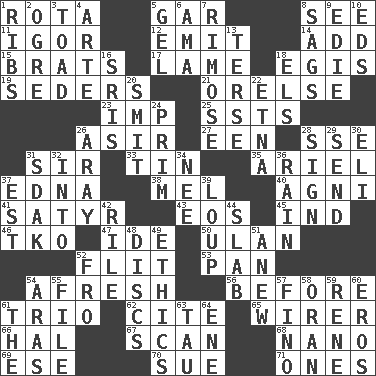 ACROSS 1. Round or rotation of duties 5. Slender fish 8. Perceive with the eye 11. Russian composer Stravinsky 12. Give off 14. Find the sum of 15. Naughty children 17. Unable to walk 18. Armor plate that protects the chest 19. Spring feasts 21. Threatening words 23. Naughty child 25. Fast planes 26. SW Saudi Arabia district 27. Car or cant ending 28. Compass dir. 31. Title for a knight 33. Metal container 35. Satellite of Uranus 37. Pulitzer Prize-winning author Ferber 38. Cartoonist voice _ Blanc 40. Hindu god of fire 41. Letch 43. Greek goddess of the dawn 45. Indiana (abbr.) 46. Ring climax 47. Binary compound 50. ____ Bator 52. Sudden quick movement 53. Baking dish 54. Anew 56. Prior to 61. Musical group of three 62. Quote 65. One who wires 66. Actor Linden 67. Skim 68. Billionth: prefix 69. Compass dir. 70. Take to court 71. Washington bills DOWN 1. Chest bones 2. Legendary monster 3. Frog relative 4. Johnson of "Laugh-In" 5. Set 6. Nursemaid (var.) 7. Full of chinks, cracks, or crevices 8. Settles 9. Singer Brickell 10. Begley and Asner 13. Laconic 16. Indian titles of respect 18. Raised railways 20. Stricken, poetically 22. Inactive volcano in Sicily 24. Demure 26. Like ___ of sunshine 28. Omen 29. Transmit 30. Connecticut Ivy Leaguer 31. Neighbor of Neb. 32. To the inside or interior of 34. Born 36. Water falling in drops from the sky 37. Eastern Standard Time (abbr.) 39. Central Nebraska county 42. Cause heat under the collar 44. Broad, flat, thick piece 48. Flat circles 49. Principles of right and wrong 51. Afresh 52. Away 54. Caspian sea tributary 55. Do some clerical work 57. A pale, very dry sherry 58. NW Algerian seaport 59. French philosopher Descartes 60. Greek god of love 61. Definite Article 63. The 19th letter of the Greek alphabet 64. Compass dir.