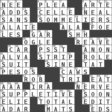 ACROSS 1. Born 4. Entreaty 8. Johnson of "Laugh-In" 12. Does sums 14. Cell (Danish) 16. Be tempered by heat 17. Without 18. Wine waiters 20. Having winglike extensions 22. Insect wing 23. Enemy 24. French article 25. Slender fish 28. Quiet! 30. Stare at amorously 31. Rob, plunder, or pillage 35. Automobile 37. Inconspicuous attention getter 40. At once, immediately (arch.) 41. Inventor's middle name 42. Empty completely 44. Hero or heavy, e.g. 45. Set of matching outer garments 46. Trig term 47. Make lace 48. Mexican monetary units 50. Crow sounds 52. Director Reiner 54. Three (prefix) 55. Consume 58. Auto club (abbr.) 61. Lyricist Gershwin 63. Boldness 65. Supplying deficiencies 70. Within a short period 71. Writer Wiesel 72. "_____ Recall" 73. Prepare for publication 74. The sixth month of the Jewish calendar 75. Floor coverings 76. Begley and Asner DOWN 1. Relating to the nose 2. Peak District village in England 3. Ferber et al. 4. Personal Computers (abbr.) 5. Lion 6. Shade tree 7. _ mater 8. Black tropical American cuckoo 9. Coral collection 10. Pacific island yam 11. Otherwise 13. Fast jet (abbr.) 15. Snakelike fish 19. Cowardly lion portrayer 21. Ovum 26. High mountains 27. Musical pauses 29. Centers 30. Speaker 32. Small Philippine buffalo 33. Electrical Unit 34. Compass dir. 35. A slight indication 36. Advice 38. Indian title of respect (Mr.) 39. Colored lightly or faintly 41. Viper 43. Lightbulb-shaped fruit 49. Land 51. Victory 53. Cy Young winner Saberhagen 55. Eat (away) 56. Prevent the occurrence of 57. Portable shelters 58. At sea 59. Old (Scot.) 60. Capital of Western Samoa 62. Smallest unit of an element 64. Compass dir. 66. For each 67. Call ___ day 68. Large container 69. Raised railways