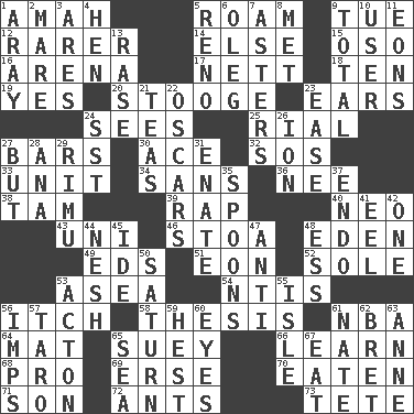 ACROSS 1. Nanny 5. Wander 9. Third day of the wk. 12. More uncommon 14. Otherwise 15. Bear (Spanish) 16. Sports stadium 17. Remaining after all deductions 18. "___ Little Indians" 19. Consenting reply 20. Moe Howard, for one 23. Hearing organs 24. Perceives with the eye 25. Monetary unit of Yemen 27. Taverns 30. Adept person 32. Mayday 33. A single undivided whole 34. Without 36. Born 38. Scottish cap 39. Hit sharply and swiftly 40. Modern: prefix 43. Single; one (prefix) 46. Portico 48. Locale of original sin 49. Begley and Asner 51. Period of immesurable duration 52. Not divided or shared with others 53. Toward the sea 54. Nuclear Threat Initiatives 56. Hankering 58. College paper 61. Basketball assoc. 64. Floor protector 65. Chop _ 66. Acquire or gain knowledge or skills 68. Adept person 69. Celtic language 70. Ingested 71. Male child 72. Pismires 73. Wig DOWN 1. Like ___ of sunshine 2. Female horse 3. Ancient Greek god of war 4. Layer 5. Former U.S. Attorney General Janet 6. Cassini of fashion 7. Michaelmas daisies 8. Was introduced to 9. "_____ Recall" 10. One who uses or employs something 11. Immeasurably long periods of time 13. Raze (variant) 21. Afternoon social gatherings 22. Motion picture awards 23. Comfort 24. Fast jet (abbr.) 26. Electrically charged atom 27. On the contrary 28. Santa ___, CA 29. Tall New Zealand timber tree 31. Related on the mother's side 35. Soup utensils 37. Inside; within (prefix) 41. Snakelike fish 42. Single 44. Soft 45. Binary compound 47. Opposed to 48. Curvy letter 50. Titan orbits this 53. Gambison 55. Small island 56. Naughty children 57. Edible starchy tuberous root 59. Behest 60. Sight organs 61. Nathan's nickname 62. Cy Young winner Saberhagen 63. Queen of England 1702-14 65. Ocean 67. Consume