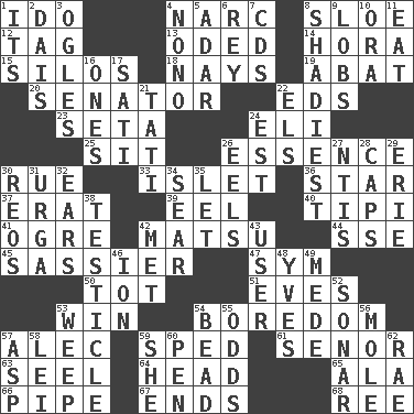 ACROSS 1. Wedding promise 4. Drug cop 8. A type of plum 12. Label 13. Wrote a lyric poem 14. Israeli folk dance 15. Grain storage towers 18. Negative votes 19. Blind as ____ 20. Elected representative 22. Begley and Asner 23. Stalk of a moss capsule 24. Biblical high priest 25. Be seated 26. Center 30. Sorrow 33. Small island 36. Play the lead 37. Part of Q.E.F. 39. Snakelike fish 40. Native american tent (variation) 41. Legendary monster 42. Taiwanese island in East China Sea 44. Compass dir. 45. More impudent 47. Symbol (abbr.) 50. Small child 51. Nights before holidays 53. Victory 54. Mood resulting from idleness 57. Actor Baldwin 59. Hurried 61. Sir (Sp.) 63. Stitch closed the eyes of (a falcon) 64. Froth on beer 65. In the manner of 66. Corncob 67. Extremities 68. To riddle DOWN 1. ___ a Wonderful Life 2. Raised platform 3. Stares 4. Words to Nanette 5. The sixth month of the Jewish calendar 6. Marina Del _, California 7. Music discs 8. Most dark, concealed or hidden 9. Tennis shots 10. Mouth or opening 11. Ingest 16. Washington bills 17. Suttee (variant) 21. Jacques of French films 22. Raised railways 24. Eastern Standard Time (abbr.) 26. Snakelike fish 27. Nuclear Threat Initiatives 28. Balmoral and tarboosh 29. 4th largest of the Great Lakes 30. Vintage cars 31. Capital and largest city of Mongolia 32. Hearing organs 34. Wither 35. Allow 38. One of the two male reproductive glands 42. Was introduced to 43. One who makes use of a thing 46. Electrically charged atom 48. Jacques Cousteau's middle name 49. Ancient Persian 52. Echolocation 53. Shed a tear 54. Necklace unit 55. Likelihood 56. Undercover agent 57. Viper 58. Luau accessory 59. A female animal or person 60. Writing instrument 62. Actress Charlotte