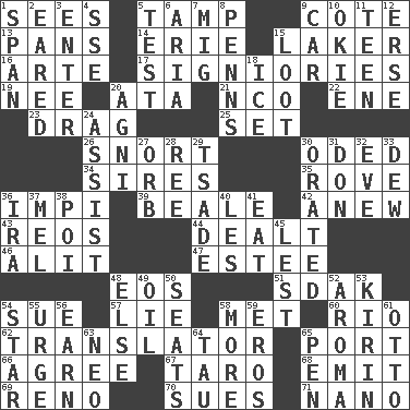 ACROSS 1. Perceives with the eye 5. Pack (down) 9. ____ d'Azur (French Riviera) 13. Baking dishes 14. 4th largest of the Great Lakes 15. Member of a famous L.A. basketball team 16. Johnson of "Laugh-In" 17. Seigniories (variant) 19. Born 20. _ moment's notice (2 wds.) 21. Non-commissioned officer (abbr.) 22. Compass dir. 23. To trail on the ground 25. Put into a specified state 26. Derisive sound 30. Wrote a lyric poem 34. Male parents of animals 35. Be footloose 36. Body of Kaffir warriors 39. Memphis, Tenn. Street 42. Afresh 43. Vintage cars 44. Started a card game 46. Set down 47. First name in cosmetics 48. Greek goddess of the dawn 51. Neighbor of Neb. 54. Institute legal proceedings 57. Untruth 58. Was introduced to 60. _ de Janeiro 62. Interpreter 65. Sweet dark-red dessert wine 66. Match 67. Pacific island yam 68. Send forth 69. Western Nevada city 70. Takes to court 71. Billionth: prefix DOWN 1. Connect, as a bridge 2. Having ears or earlike features 3. Keyboard key 4. Compass dir. 5. Trial 6. Operatic vocal solo 7. Russian fighter aircraft 8. Actor Sean's family 9. 4-wheeled motor vehicle 10. Migrant worker of the '30s 11. Adolescent 12. Celtic language 15. Plunder 18. Frozen water 20. Hindu god of fire 24. Help 27. Globe 28. To separate or throw off 29. Sadhe (variant) 30. Declaimed 31. Spanish title 32. First lady 33. Morning condensation 36. Retirement account (abbr.) 37. Cartoonist voice _ Blanc 38. Luau course 40. French article 41. Ingest 45. For fear that 48. Otherwise 49. Petroleum 50. Theater features 52. Scent 53. Japanese brewing company 54. Play the lead 55. Goad 56. Merit 58. Greater amount 59. Greek god of love 61. "Beetle Bailey" pooch 63. Modern: prefix 64. The 19th letter of the Greek alphabet 65. Fenced enclosure