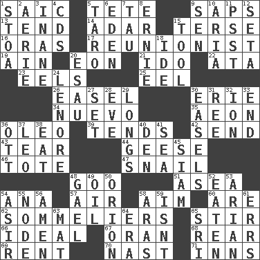 ACROSS 1. Ketch in the Levant 5. Wig 9. Plant excrements 13. Watch over 14. The sixth month of the Jewish calendar 15. Laconic 16. Mouths or openings 17. One who advocates reunion 19. The 18th letter of the Arabic alphabet 20. Period of immesurable duration 21. Wedding promise 22. "One Day ___ Time" 23. Snakelike fish 25. Snakelike fish 26. Artist's stand 30. One of the Great Lakes 34. New (sp.) 35. Age 36. Margarine 39. Looks after 42. Post 43. Rend 44. Honkers 46. Carryall 47. Slow-paced one 48. Thick or sticky substance 51. At sea 54. Santa ___, CA 57. Atmosphere 58. Direct toward a target or goal 60. "We ___ not amused" (Victoria) 62. Wine waiters 65. Use a swizzle stick 66. Perfect 67. NW Algerian seaport 68. Tail end 69. Monthly bill 70. Political cartoonist Thomas 71. Lodging establishments DOWN 1. Portico 2. Nest on high 3. Silly 4. Music discs 5. Pacific island yam 6. Paradise 7. The 19th letter of the Greek alphabet 8. Bert's buddy 9. Elected rep. 10. Roberta Peters solo 11. Inconspicuous attention getter 12. Stalk of a moss capsule 15. Utensil 18. Binary compound 20. Son of Isaac 24. Poe poem 27. Put into a specified state 28. First lady 29. Yearns 30. Artist's stands 31. To riddle 32. Electrically charged atom 33. Conclude 36. Baseball player Mel 37. Lion 38. Erode 40. Lair 41. Ocean 45. Thailand, formerly 48. Highlander 49. Petroleum 50. Constellation of myth 52. Ingested 53. Believer in; advocate of (suffix) 54. SW Saudi Arabia district 55. Connecting point 56. So be it 58. Caspian sea tributary 59. Is not 61. Blunders 63. Floor protector 64. Period 65. _ Lanka