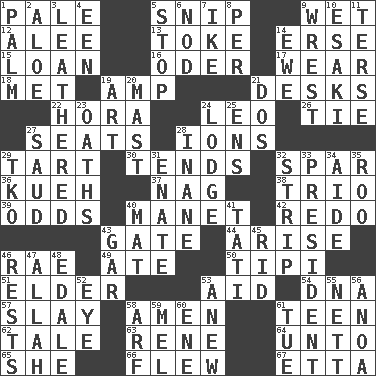 ACROSS 1. Diluted with white 5. Clip 9. Soggy 12. Toward shelter 13. Puff or smoke 14. Celtic language 15. Grant temporary use of 16. River in Europe 17. Erode 18. Was introduced to 19. Electrical Unit 21. Writing tables 22. Israeli folk dance 24. Lion 26. Make a knot 27. Theater features 28. Charged particles 29. Small pie 30. Watches over 32. Practice fight 36. Malaysian steamed pastry 37. Tired old horse 38. Musical group of three 39. Probability 40. French painter Edouard 42. Do over again 43. Yard entry 44. Originate 46. Actress Charlotte 49. Had dinner 50. Native american tent (variation) 51. A person who is older than you are 53. Assist 54. Heredity factor (abbr.) 57. Kill 58. So be it 61. Adolescent 62. Lie 63. French philosopher Descartes 64. To (old English) 65. A female animal or person 66. Soared 67. Singer James DOWN 1. Inside of hand 2. _ vera 3. Resembling or made to resemble leather 4. Car or cant ending 5. Cease 6. Dreamland 7. Mamie's husband 8. For each 9. Take or capture by force 10. 1973 Nobel Price Winner (Physics) Leo 11. Laconic 14. She-sheep 19. Tate display 20. Vertical spar for supporting sails 21. Two (Sp.) 23. Expletives 24. Cabin 25. Followers of ems 27. Saudi Arabian king (1953-1964) 28. Silly 29. Ring climax 31. Related on the mother's side 32. Empty completely 33. Elected leader of a country 34. Assistant 35. Friend of Pooh 40. Floor protector 41. Jacques of French films 43. Slender fish 45. To free from 46. Musical pauses 47. Assad's deity 48. Peak District village in England 52. Sight organ 53. Afresh 55. Remaining after all deductions 56. Small Philippine buffalo 58. Sandy's bark 59. Cartoonist voice _ Blanc 60. Compass dir. 61. Third day of the wk.