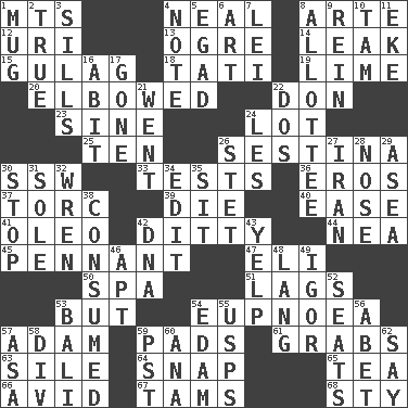 ACROSS 1. Mountains (abbr.) 4. Be tempered by heat 8. Johnson of "Laugh-In" 12. RI univ. 13. Legendary monster 14. Path through which fluid escapes 15. Russian prison camp 18. Jacques of French films 19. Welles in "The Third Man" 20. Turned at an angle; bent 22. Spanish title 23. Trig term 24. Car dealer's back yard 25. "___ Little Indians" 26. French poetic form 30. Compass dir. 33. Trials 36. Greek god of love 37. Torque (variant) 39. Expire 40. Comfort 41. Butter sub 42. Simple song 44. Teachers' org. 45. Pre-World Series prize 47. Biblical high priest 50. Health resort 51. Falls behind 53. Yet 54. Normal relaxed breathing 57. First of billions? 59. Writing tablets 61. Takes hold of 63. Filth; sediment 64. Fastener 65. Beverage made from leaves 66. Enthusiastic 67. Scottish caps 68. Filthy place DOWN 1. Large cup 2. Loyal 3. Beverly of Met fame 4. Make mention of 5. Mild oath 6. Tate display 7. Flowery wreath 8. One to whom something is allotted 9. It's straight from the horse's mouth 10. Scottish cap 11. Make supply last 16. "This won't hurt ____!" 17. Went 21. Gone 22. Two (Sp.) 24. French article 26. Proofreading order 27. SW Asia republic 28. Characteristic smell of wine 29. At sea 30. Discontinue 31. Not divided or shared with others 32. Songbird 34. Prepare for publication 35. Be seated 38. Ingested 42. Heredity factor (abbr.) 43. Sharp bark 46. Fitting 48. Long (Scottish) 49. Russian composer Stravinsky 52. Theater features 53. Indonesian resort city 54. Dutch treat 55. United States Postal Service (abbr.) 56. Collude with 57. White ___ sheet 58. HTML Container Element 59. Pacific Standard Time (abbr.) 60. Santa ___, CA 62. Declare