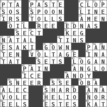 ACROSS 1. Parent Teacher Assoc. 4. Thick mixture 9. Hoof sound 13. Mayday 14. Soup utensil 15. Actor's bit 16. Big collection agency 17. For Whom the Bell _____ 18. So be it 19. Petroleum 21. To separate or throw off 22. Ferber et al. 24. Religious group 26. Barrel 27. Relating to or accompanying birth 29. Airtight sealed metal containers 30. 1973 Nobel Price Winner (Physics) Leo 31. Bride's dress 33. Baking dish 36. "___ Little Indians" 37. Electrical Measurement 40. _ tizzy (2 wds.) 41. Make lace 42. Arranges properly for use 43. Utah city north of Ogden 45. Ache 47. White American of non-Hispanic descent 48. Frozen water 49. Actor Griffith 50. Scornful expression 52. Compass dir. 54. Chief or king in Benin or Nigeria 56. Actor Baldwin 57. Broken piece 59. Santa ___, CA 61. Grand slam 62. Sun: prefix 63. Not either 64. Snakelike fish 65. _____ Park, CO 66. Krazy ___ of comics DOWN 1. Air pressure measure (abbr.) 2. "Corrida" creature 3. Helper 4. Pacific Standard Time (abbr.) 5. To the left, to Queeg 6. Not divided or shared with others 7. Lacquered or enameled metalware 8. Followers of ems 9. Gives out a loud, resonant sound 10. Pale green bean 11. Singles 12. Writing instrument 20. Path through which fluid escapes 22. Supplementing with great effort 23. Lair 25. 154 in Roman numerals 27. Remaining after all deductions 28. Toward the sea 29. It was, poetically 31. Small, secluded valley 32. Baseball player Mel 33. Porcine juvenile vault 34. Of or related to the anus 35. Billionth: prefix 38. Flexible twig of a willow tree 39. Enthusiasm 44. Southwest Nigerian state 45. Components 46. Adept person 49. Nest on high 50. _ gin 51. 1994 drama film starring Jodie Foster 52. "______ My Girl" (Turtles hit) 53. Table seasoning 55. Small Philippine buffalo 56. "___ Maria" 57. A female animal or person 58. Two (Sp.) 60. Tate display