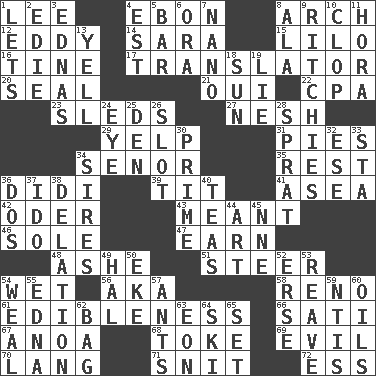 ACROSS 1. Area sheltered from the wind 4. Inky black, to poets 8. Bowlike part 12. Whirlpool 14. "Two Mules for Sister ____" 15. _ and Stitch 16. Prong on a fork 17. Interpreter 20. Lick closed 21. Fr. "Yes" 22. Tax preparer (abbr.) 23. Bobsleighs 27. Soft 29. Sharp bark 31. Sliced desserts 34. Sir (Sp.) 35. State of inaction 36. "You Light Up My Life" star Conn 39. Teat (slang) 41. At sea 42. Baltic tributary 43. Intended 46. Not divided or shared with others 47. Merit 48. American tennis player Robert 51. Guide 54. Dripping 56. Alias (abbr.) 58. Western Nevada city 61. The property of being fit to eat 66. Suttee (variant) 67. Small Philippine buffalo 68. Casino tip 69. Morally bad or wrong 70. Long (Scottish) 71. In a ____ (agitated or irritated) 72. Double-curved letter DOWN 1. Allows 2. Singer Brickell 3. Ferber et al. 4. Eastern Standard Time (abbr.) 5. Oblong piece of solid material 6. Mouth or opening 7. Billionth: prefix 8. Chicken ___ king 9. Actors Guy, Robert Welles, and Clint 10. Hoof sound 11. Israeli folk dance 13. Shout 18. Player for Phoenix 19. Falsehood 24. Sight organ 25. Lair 26. Notch 28. Small fatty European fish 30. First class 32. Compass dir. 33. R.R. building 34. Male parents of animals 36. Two (Sp.) 37. Wedding promise 38. Conveyance 40. Beverages made from leaves 44. Nonscientific branch of learning 45. Compass dir. 49. Actor Linden 50. Supplement with great effort 52. Celtic language 53. Break or tear apart 54. Welt 55. Pulitzer Prize-winning author Ferber 57. Pismires 59. Nuclear Threat Initiatives 60. Lubricates 62. Paper or plastic container 63. Period of immesurable duration 64. What Jean-Claude Killy likes to do 65. Arrange properly for use