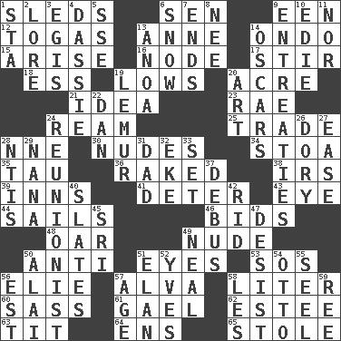 ACROSS 1. Bobsleighs 6. Elected rep. 9. Car or cant ending 12. Ancient Roman robes 13. Queen of England 1702-14 14. Southwest Nigerian state 15. Get up 16. Connecting point 17. Use a spoon 18. Double-curved letter 19. Coldest temperatures 20. Land measure 21. The content of cognition 23. Actress Charlotte 24. 480, 500 or 516 sheets of paper 25. Exchange 28. Compass dir. 30. Unadorned figures 34. Portico 35. The 19th letter of the Greek alphabet 36. Moved through 38. Big collection agency 39. Restaurants 41. Prevent from occurring 43. Sight organ 44. Moves on water 46. Auction offers 48. Boat paddle 49. Unadorned 50. Against 51. Snake ____ (dice throw) 53. Mayday 56. Writer Wiesel 57. Inventor's middle name 58. 61 cubic inches 60. Backtalk 61. Highlander 62. First name in cosmetics 63. Teat (slang) 64. Followers of ems 65. Fur scarf DOWN 1. R.R. building 2. Old wives' tales, e.g. 3. Armor plate that protects the chest 4. Small ungulate mammals of Africa 5. Compass dir. 6. Frozen precipitation 7. Extremities 8. Born 9. Pleas 10. Singer Brickell 11. And not 13. Small Philippine buffalo 14. Motion picture awards 19. Arboreal primate 20. Nonscientific branch of learning 22. Daniel's nick name 24. One who advocates reunion 26. Dinghy 27. Comfort 28. Nuclear Threat Initiatives 29. Grandmother 31. Male parent 32. Make supply last 33. Arrange properly for use 37. To get out of a bus 40. Chalkboards 42. To free from 45. _ Lanka 47. Cease 49. Anneal 50. Jai ____ 51. Enthusiasm 52. Jacques Cousteau's middle name 54. "Beetle Bailey" pooch 55. Stitch closed the eyes of (a falcon) 56. Eastern Standard Time (abbr.) 57. Personal question 58. French article 59. To riddle