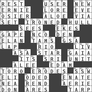 ACROSS 1. Repose 5. One who uses or employs something 9. ___ Haven, CT 12. Bert's buddy 14. Old wives' tales, e.g. 15. Night before a holiday 16. Flexible twig of a willow tree 17. Medicinal plant 18. By way of 19. Arrange properly for use 20. Pressed 23. Frame or body of a ship 24. Perceives with the eye 25. Makes supply last 27. Stare wonderingly 30. Non-commissioned officer (abbr.) 32. Lair 33. Enthusiasm 34. Scottish caps 36. Girls' org. (abbr.) 38. Infant locale 39. _ de Janeiro 40. 54 in ancient Rome 43. White ___ sheet 46. Play the lead 48. Greek goddess of the earth (variant) 49. It is 51. _ Lanka 52. A single undivided whole 53. Toward shelter 54. Dutch treat 56. "Corrida" creature 58. Eats (away) 61. Compass dir. 64. Biblical high priest 65. Wrote a lyric poem 66. Related on the mother's side 68. Teachers' org. 69. Tear apart 70. Nest on high 71. Spanish title 72. Ancient Greek god of war 73. Canvas cover DOWN 1. Vintage cars 2. Celtic language 3. In a ____ (agitated or irritated) 4. Neckwear 5. ____ Bator, Mongolia 6. Not divided or shared with others 7. Worn away 8. Portuguese money of account (variant) 9. Congenital growth or mark on the skin 10. Tending to cause great harm 11. Welt 13. 4th largest of the Great Lakes 21. Monthly bill 22. Motion picture awards 23. Coop moms 24. Elected rep. 26. Cask 27. Set 28. According to 29. Dad 31. Leaves out 35. Flew 37. ____ Jay Lerner 41. One more than two 42. Large container 44. Grain storage tower 45. Had dinner 47. Travel on or in a vehicle 48. Chewing product 50. Sowing specialist 53. Believer in; advocate of (suffix) 55. Toward the sea 56. Be inclined (to) 57. Margarine 59. French philosopher Descartes 60. Likelihood 61. "Two Mules for Sister ____" 62. Move through with a circular motion 63. Shed a tear 65. Mouth or opening 67. Fish or hair follower