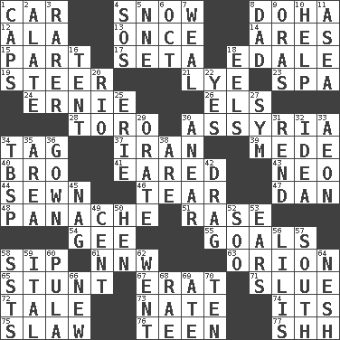 ACROSS 1. 4-wheeled motor vehicle 4. Overwhelm 8. Capital of the state of Qatar 12. According to 13. Single time 14. Ancient Greek god of war 15. Role in a play 17. Bristle 18. Peak District village in England 19. Navigate 21. Potassium hydroxide 23. Health resort 24. Bert's buddy 26. Raised railways 28. "Corrida" creature 30. Nineveh was its capital 34. Label 37. SW Asia republic 39. Ancient Persian 40. Sis' sibling 41. Having ears or earlike features 43. Modern: prefix 44. Stitched 46. Pull into pieces 47. Daniel's nick name 48. Flamboyance 51. Raze (variant) 54. Turn to the right 55. Purposes of endeavors 58. Small drink 61. Compass dir. 63. Constellation of myth 65. Difficult or unusual or dangerous feat 67. Part of Q.E.F. 71. Turn sharply 72. Story 73. Nathan's nickname 74. ___ a Wonderful Life 75. Cole _ (cabbage dish) 76. Adolescent 77. Quiet! DOWN 1. Balmoral and tarboosh 2. Having winglike extensions 3. More uncommon 4. Mayday 5. Compass dir. 6. Sep. follower 7. Welt 8. Male parent 9. Mouths or openings 10. Assist 11. At sea 16. Portable shelter 18. Snakelike fish 20. River (Sp.) 22. Affirmative reply 25. 4th largest of the Great Lakes 27. Symbol (abbr.) 29. Speak pompously 30. Approach 31. Tear apart 32. The content of cognition 33. Age 34. Cook's measure (abbr.) 35. Type of rug 36. Woman's formal wear 38. "We ___ not amused" (Victoria) 42. To trail on the ground 45. Tired old horse 49. Penny 50. Layer 52. "Barney Miller" actor Jack 53. Hearing organs 56. Ms. Damita and namesakes 57. Compass direction 58. Fast planes 59. Slanted text style (abbr.) 60. Monetary unit of Botswana 62. Left 64. Soft 66. ___ Haven, CT 68. Actress Charlotte 69. Had dinner 70. Nine, plus one