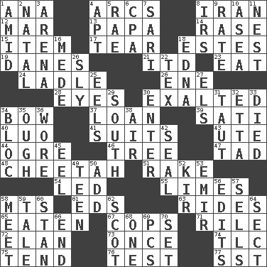 ACROSS 1. Santa ___, CA 4. Curves 8. SW Asia republic 12. Impair 13. Dad 14. To erase 15. A distinct part 17. Pull apart 18. _____ Park, CO 19. Natives or inhabitants of Denmark 21. It would 23. Erode 24. Dipping utensil 26. Compass dir. 28. Snake ____ (dice throw) 30. Honored 34. Ribbon knot 37. Grant temporary use of 39. Suttee (variant) 40. Nilotic language 41. Sets of matching outer garments 43. Shoshoni 44. Legendary monster 46. Woody plant 47. Small amount or degree 48. Leopard's kin 51. Libertine 54. Directed 55. Citrus fruits 58. Mountains (abbr.) 61. Begley and Asner 63. Amusement-park features 65. Consumed 67. 911 reaches them 71. Cause heat under the collar 72. Liveliness 73. At one time in the past 74. Affectionate concern, for short 75. Watch over 76. Trial 77. Fast jet (abbr.) DOWN 1. Among 2. Relating to or accompanying birth 3. Sports stadium 4. Fitting 5. Actress Charlotte 6. Accounting whiz (abbr.) 7. Indian skirt 8. Big collection agency 9. Assign a rank or rating to 10. Toward the sea 11. A home for chicks 16. Ancient Persian 18. Pulitzer Prize-winning author Ferber 20. Mischievous 22. John Ritter's dad 25. Snakelike fish 27. Raised railways 29. 180 degrees 30. Keyboard key 31. Drawn tight 32. Singer James 33. Passed on 34. Coalition 35. Ending for "Through" and "Enough" 36. Had on 38. Atmosphere 42. Lick closed 45. Snakelike fish 49. Adolescent 50. Find the sum of 52. Apertif with cassis 53. Arab leader 56. Prepares for publication 57. Makes a sale 58. Rendezvous 59. Lie 60. Comedian Laurel of Laurel & Hardy 62. Native of Scotland 64. Religious group 66. Conclude 68. Single 69. Personal Computers (abbr.) 70. Put into a specified state