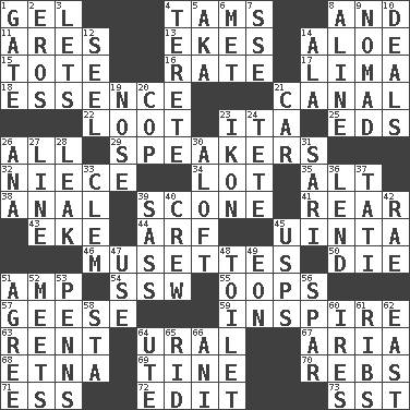 ACROSS 1. Set 4. Scottish caps 8. Added to 11. Ancient Greek god of war 13. Makes supply last 14. Medicinal plant 15. Lug 16. Assign a rank or rating to 17. Pale green bean 18. Center 21. Lessep's creation 22. Plunder 23. Call ___ day 25. Begley and Asner 26. 100% 29. Orators 32. Sibling's daughter 34. Car dealer's back yard 35. The first octave above the treble staff 38. Of or related to the anus 39. Biscuitlike quick bread 41. Rump 43. Supplement with great effort 44. Sandy's bark 45. National forest in Provo, Utah 46. French bagpipes 50. Pass on 51. Electrical Unit 54. Compass dir. 55. I made a mistake 57. Honkers 59. Stimulate to action 63. Monthly bill 64. Mountain range 67. Roberta Peters solo 68. Inactive volcano in Sicily 69. Prong on a fork 70. Confederate soldiers (slang) 71. Double-curved letter 72. Prepare for publication 73. Fast jet (abbr.) DOWN 1. Yard entry 2. Greek god of love 3. Allows 4. Cylindrical with tapered ends 5. Alias (abbr.) 6. Was introduced to 7. Compass dir. 8. Place in a line 9. Wanderer 10. Allots cards 12. Sew up the eyelids of hawks and falcons 14. Wing 19. Sense of smell 20. Police officer (slang) 21. 4-wheeled motor vehicle 23. Visual representation of an object 24. Wig 26. Santa ___, CA 27. Actor's bit 28. Path through which fluid escapes 30. High up in or into the air 31. Indian skirt 33. Clement's nick name 36. Grant temporary use of 37. Jacques of French films 39. Backtalk 40. Group working together 42. Actress Charlotte 45. United States Postal Service (abbr.) 47. Purpose 48. Bathroom 49. Age 51. Match 52. Confronts 53. Actor Sean's family 56. Practice fight 58. R.R. building 60. Angers 61. Teases 62. 90 degrees 64. Shoshoni 65. To free from 66. Cuckoo
