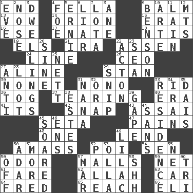 ACROSS 1. Conclusion 4. Man or boy (slang) 9. Lip ointment 13. Solemn pledge 14. Constellation of myth 15. Part of Q.E.F. 16. Compass dir. 17. Related on the mother's side 18. Nuclear Threat Initiatives 19. Raised railways 21. Lyricist Gershwin 22. NE Netherlands city 24. Actor's bit 26. Corporate head (abbr.) 27. Place in a line 29. Comedian Laurel of Laurel & Hardy 30. Music written for nine 31. Words to Nanette 33. To free from 36. Coat; cloak 37. Pulling into pieces 40. Period 41. It is 42. Fastener 43. Slender Brazilian palm 45. Stalk of a moss capsule 47. Aches 48. Single 49. Grant temporary use of 50. Collect or gather 52. Luau course 54. Elected rep. 56. Scent 57. Shopping centers 59. Fish or hair follower 61. Conductor's collection 62. Assad's deity 63. Auto 64. Flintstone 65. Arrive at 66. Biblical high priest DOWN 1. First lady 2. Characteristic smell of wine 3. Residences 4. Enemy 5. Bert's buddy 6. One who doesn't tell the truth 7. Globular water bottle used in Asia 8. A saturated hydrocarbon 9. Gillaume's butler role 10. Johnson of "Laugh-In" 11. (Had) reclined 12. Mountains (abbr.) 20. Trig term 22. 13-14th century defensive garment 23. Ocean 25. Remaining after all deductions 27. Against 28. Spoils 29. Clip 31. Nanny 32. Mouth or opening 33. Dwelling 34. SW Asia republic 35. Raised platform 38. _____ Park, CO 39. Open wide 44. Without 45. Flew 46. Followers of ems 49. Pale purple color 50. The sixth month of the Jewish calendar 51. Greater amount 52. Diluted with white 53. Spanish pot 55. Anneal 56. Below a satisfactory level 57. Impair 58. Quiet! 60. Three (prefix)