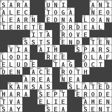 ACROSS 1. "Two Mules for Sister ____" 5. University (slang) 8. Cuckoo 11. Actor Baldwin 12. Ancient Roman robe 14. Modern: prefix 15. Acquire or gain knowledge or skills 17. Pulitzer Prize-winning author Ferber 18. Grant temporary use of 19. Cigar-shaped 21. Severe or trying experience 23. Call ___ day 25. Be footloose 26. Fast planes 27. Conclusion 28. "___ Little Indians" 31. By way of 33. Direct toward a target or goal 35. Practice fights 37. Farming town in central California 38. To separate or throw off 40. Norwegian king 41. Dodge 43. Label 45. Sep. follower 46. Lair 47. Adept person 50. Writer of Portnoy's Complaint (1969) 52. Type of rug 53. Teachers' org. 54. Sunflower state 56. Scheduled 61. Hindu Mythology: god of death 62. Back-to-school mo. 65. Wear away 66. Federal power corp. 67. Writer Wiesel 68. So be it 69. Declare 70. Ocean 71. Transmitted DOWN 1. Table seasoning 2. Toward shelter 3. Tail end 4. Measure of real estate 5. Shoshoni 6. Dreamland 7. Refuse to acknowledge 8. Small Philippine buffalo 9. Actress Patricia 10. Electrically charged atom 13. Composer Copland 16. Nuclear Threat Initiatives 18. Area sheltered from the wind 20. Singer James 22. Movie discs 24. SW Saudi Arabia district 26. Alleged 28. Baby powder 29. Part of Q.E.F. 30. Science/research agcy. 31. Grand slam 32. Goddess of spring and wife of Bragi 34. Was introduced to 36. "Silly old bear" 37. Directed 39. Merit 42. Hearing organs 44. Moves 48. Desist 49. Artist's stands 51. Lie 52. Santa ___, CA 54. Polynesian shrub of the pepper family 55. Like ___ of sunshine 57. Ancient river in northeast Turkey 58. Heavy book 59. Paradise 60. Gouge 61. Mountains (abbr.) 63. Sliced dessert 64. Beverage made from leaves
