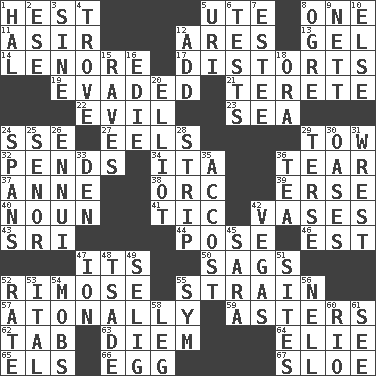 ACROSS 1. Command 5. Shoshoni 8. Single 11. SW Saudi Arabia district 12. Ancient Greek god of war 13. Set 14. Poe poem 17. What propaganda does 19. Dodged 21. Cigar-shaped 22. Tending to cause great harm 23. Ocean 24. Compass dir. 27. Snakelike fish 29. Pull behind 32. Depends 34. Call ___ day 36. Pull apart 37. Singer Murray 38. The grampus (Milton) 39. Celtic language 40. Part of speech 41. Nervous spasm 42. Flower holders 43. Indian title of respect (Mr.) 44. Introduce or present, as a question 46. Eastern Standard Time (abbr.) 47. It is 50. Droops 52. Full of chinks, cracks, or crevices 55. Put through a sieve 57. Lacking a tonal center or key 59. Michaelmas daisies 62. Bar bill 63. South Vietnam president (1954) 64. Writer Wiesel 65. Raised railways 66. Ovum 67. _ gin DOWN 1. Actor Linden 2. Compass dir. 3. Trig term 4. Collection of objects 5. RI univ. 6. Trials 7. First name in cosmetics 8. Legendary monster 9. Remaining after all deductions 10. Otherwise 12. Say or write further 15. All-night dance parties 16. Singer Brickell 18. Mouth or opening 20. American author Paul (1891-1958) 24. Connects, as a bridge 25. Sir (Sp.) 26. World-weariness 28. Long narrow piece of something 29. Laconic 30. Fertile tracts in a desert 31. Take or capture by force 33. Lair 35. Buttonhole 36. Beverage made from leaves 42. Viva Las _ 45. "Two Mules for Sister ____" 47. Electrically charged atom 48. Sadhe (variant) 49. Major League Baseball Commissioner Bud 51. Locates 52. Assign a rank or rating to 53. Slanted text style (abbr.) 54. Disorderly crowds 55. Symbol (abbr.) 56. 1994 drama film starring Jodie Foster 58. Part of a journey 60. River (Sp.) 61. Perceive with the eye