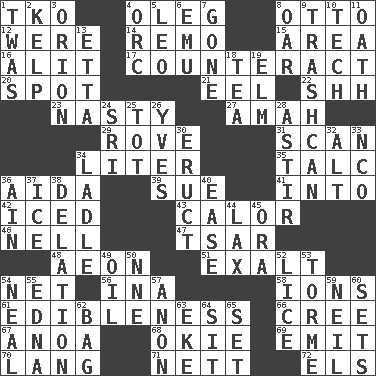 ACROSS 1. Ring climax 4. Cassini of fashion 8. "Beetle Bailey" pooch 12. Past tense of be (plural) 14. San ____ (Riviera town) 15. Length times width 16. Set down 17. Neutralize 20. Blemish 21. Snakelike fish 22. Quiet! 23. Characterized by obscenity 27. Nanny 29. Be footloose 31. Glance over 34. 61 cubic inches 35. Baby powder 36. Opera by Verdi 39. Take to court 41. To the inside or interior of 42. On the rocks 43. Bodily heat indicating an inflammation 46. 1994 drama film starring Jodie Foster 47. Russian ruler of old 48. Age 51. Honor 54. Fish or hair follower 56. _ tizzy (2 wds.) 58. Charged atoms 61. The property of being fit to eat 66. Algonquian 67. Small Philippine buffalo 68. Migrant worker of the '30s 69. Send forth 70. Austrian-born American filmmaker Fritz 71. Remaining after all deductions 72. Raised railways DOWN 1. It was, poetically 2. Seaweed 3. Constellation of myth 4. The grampus (Milton) 5. Lion 6. Australian flightless bird 7. Went 8. Boat paddle 9. File 13 10. Technology 11. Pledge 13. Singer James 18. Beverage made from leaves 19. Shade tree 24. _ Lanka 25. Small child 26. Jacques Cousteau's middle name 28. Being in motion 30. Spew [out] 32. The first octave above the treble staff 33. Non-commissioned officer (abbr.) 34. Dipping utensil 36. The 18th letter of the Arabic alphabet 37. Frozen water 38. Conveyance 40. Relaxation 44. Not strict 45. Mouth or opening 49. Lubricate 50. Compass dir. 52. Louse (plural) 53. Singer Mel 54. Actress Patricia 55. Pulitzer Prize-winning author Ferber 57. Soon (poet.) 59. Famous astronaut Armstrong 60. Arranges properly for use 62. Container for groceries 63. Make supply last 64. Be seated 65. Arrange properly for use