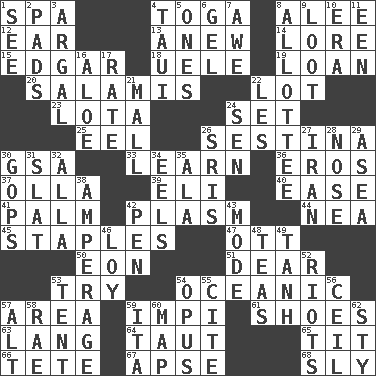 ACROSS 1. Health resort 4. Ancient Roman robe 8. Toward shelter 12. Hearing organ 13. Afresh 14. Old wives' tales, e.g. 15. _ Allan Poe 18. Ubangi River tributary 19. Grant temporary use of 20. Deli grouping 22. Car dealer's back yard 23. Globular water bottle used in Asia 24. Arrange properly for use 25. Snakelike fish 26. French poetic form 30. Girls' org. (abbr.) 33. Memorize 36. Greek god of love 37. Spanish pot 39. Connecticut Ivy Leaguer 40. Comfort 41. Inside of hand 42. Suffix with ecto or cyto 44. Teachers' org. 45. Paper fasteners 47. Baseball player Mel 50. Period of immesurable duration 51. Letter starter 53. Attempt 54. Pertaining to the sea 57. Length times width 59. Body of Kaffir warriors 61. Imelda's hoard 63. Austrian-born American filmmaker Fritz 64. Drawn tight 65. Teat (slang) 66. False hair 67. Domed church section 68. Insidious DOWN 1. Observe 2. Groovy apts. 3. Therefore, facetiously 4. "Change" in Tahitian 5. Singles 6. Set 7. Deep reverence 8. One to whom something is allotted 9. Spoils 10. Epoch 11. Car or cant ending 16. _ vera 17. Pace 21. Shopping center 22. French article 24. Elected rep. 26. Indian titles of respect 27. SW Asia republic 28. Olfactory organ 29. At sea 30. Republicans 31. Narrow board 32. Silent film actress Nazimova 34. Snakelike fish 35. Insect wing 38. Electrical Measurement 42. Animal enclosure 43. Method 46. Myrna of the movies 48. Beverages made from leaves 49. Hyperbolic tangent 52. Debaucheries 53. Portable shelter 54. Musical composition 55. Quote 56. To provide with a ceiling 57. The first octave above the treble staff 58. Actress Charlotte 59. Call ___ day 60. Atlas unit 62. Filthy place