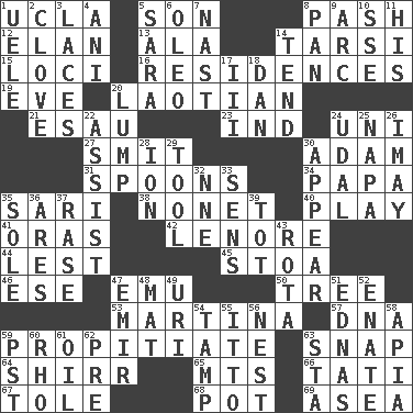 ACROSS 1. Southern CA. univ. 5. Male offspring 8. Romantic infatuation 12. Enthusiasm 13. Insect wing 14. Tarsus (plural) 15. Locales 16. Homes 19. Night before a holiday 20. Of or relating to Laos or its people 21. He sold his birthright 23. Working for oneself (abbr.) 24. Single; one (prefix) 27. Stricken, poetically 30. First of billions? 31. Soup utensils 34. Dad 35. Indian skirt 38. Music written for nine 40. Live dramatic performance 41. Mouths or openings 42. Poe poem 44. For fear that 45. Portico 46. Compass dir. 47. Australian flightless bird 50. Relationship diagram 53. Chrissie's court nemesis 57. Heredity factor (abbr.) 59. Conciliate 63. Fastener 64. Bake eggs in their shells 65. Mountains (abbr.) 66. Jacques of French films 67. Lacquered or enameled metalware 68. Cooking vessel 69. At sea DOWN 1. Ubangi River tributary 2. Garlic unit 3. Shoestrings 4. Black tropical American cuckoo 5. "Two Mules for Sister ____" 6. Butter sub 7. Political cartoonist Thomas 8. Baking dish 9. Curve 10. Compass dir. 11. Part of HMS, perhaps 14. Look after 17. One more than two 18. Daniel's nick name 20. Mass 22. Help 24. Freehold land 25. California wine valley 26. "If ____ say so..." 28. Electrically charged atom 29. Utensil 30. Seem 32. Compass dir. 33. Elected reps. 35. Not divided or shared with others 36. Ancient Greek god of war 37. To erase 39. Small child 43. Roll call or roster of names 47. Independent ruler or chieftain 48. Floor protector 49. RI univ. 51. Ferber et al. 52. Related on the mother's side 54. Pack (down) 55. "Tell ____ the Marines!" 56. Egg locale 58. Capital of Western Samoa 59. Pacific Standard Time (abbr.) 60. 17th letter of the Greek alphabet 61. Lubricate 62. Before (prefix) 63. R.R. building