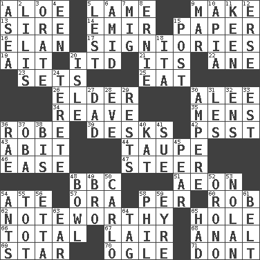 ACROSS 1. Medicinal plant 5. Unable to walk 9. Cause to be 13. Father 14. Independent ruler or chieftain 15. Some stationery 16. Liveliness 17. Seigniories (variant) 19. Small island 20. It would 21. ___ a Wonderful Life 22. One (Scot) 23. Puts into a specified state 25. Consume 26. A person who is older than you are 30. Toward shelter 34. Break or tear apart 35. Not women's 36. Loose flowing garment 39. Writing tables 42. Inconspicuous attention getter 43. "This won't hurt ____!" 44. Grayish beige 46. Comfort 47. Bull 48. English channel? 51. A really long time 54. Had dinner 57. Mouth or opening 58. For each 60. Director Reiner 62. Music shop? 65. Opening into or through something 66. Add up to 67. Den 68. Of or related to the anus 69. Play the lead 70. Stare at amorously 71. Do not DOWN 1. Toward the sea 2. Ms. Damita and namesakes 3. Declaim 4. Car or cant ending 5. For fear that 6. Among 7. Russian fighter aircraft 8. Bert's buddy 9. Impair 10. Capital of Western Samoa 11. Peachy ____! 12. Celtic language 15. Mail 18. Call ___ day 20. Capri or Wright 24. Cylindrical with tapered ends 27. Male parent 28. First lady 29. Musical pauses 30. Electrical Unit 31. French article 32. Followers of ems 33. Eastern Standard Time (abbr.) 36. Actress Charlotte 37. Chief or king in Benin or Nigeria 38. Altar cloth linen 40. Krazy ___ of comics 41. Institute legal proceedings 45. Lightbulb-shaped fruit 48. Soup holder 49. Sis' sibling 50. Monte _, Las Vegas Hotel/Casino 52. U. of Maine site 53. Pitcher Ryan 54. Pismires 55. A blast of a horn 56. Singer James 58. Silvers or Donahue 59. Jane of fiction 61. Waist strap 63. Hearing organ 64. Label 65. Possessed