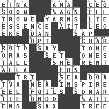 ACROSS 1. Inactive volcano in Sicily 5. Nanny (var.) 8. Corporate head (abbr.) 11. Within a short period 12. Settles 14. Pipe bend 15. Marketplace scale 17. Entertaining tales 18. Untruth 19. Core 21. Small island 22. Lion 23. Make supply last 24. One of the 12 tribes of Israel 25. Plant excrement 27. Choose 28. Burn to charcoal 31. Printing process, for short 35. Declare 37. Heavy book 38. Mouths or openings 39. Arrange properly for use 41. Singles 42. Baby powder 43. A female animal or person 45. Monthly bill 46. Silent film actress Nazimova 47. Begley and Asner 49. Three (prefix) 51. Ocean 52. ___ good deed 55. Federal power corp. 57. Teachers' org. 60. Heighten or intensify 62. Snakelike fish 63. Fencing necessities 65. Underwater navigation system 66. Make a knot 67. Southwest Nigerian state 68. Suttee (variant) 69. Followers of ems 70. Saxophone 71. Family _ (genealogy) DOWN 1. First name in cosmetics 2. Cod relative 3. Trap for birds or small mammals 4. Queen of England 1702-14 5. White ___ sheet 6. Hindu Mythology: god of death 7. Hindu god of fire 8. Portable communications device 9. Writer Wiesel 10. Butter sub 13. Fast planes 16. Inside; within (prefix) 17. Gossips 20. Balmoral and tarboosh 26. Thespian 29. So be it 30. State of inaction 31. Round or rotation of duties 32. Of the mouth 33. Baron Munchausen's specialties 34. Motion picture award 36. It is so 40. College paper 44. Locale of original sin 48. Backtalk 50. Information 52. Middle Eastern gold or silver currency 53. Speak pompously 54. Nest on high 55. False hair 56. Distinctive style or manner 58. Immeasurably long periods of time 59. Opera by Verdi 61. Mail 64. Brine-cured salmon