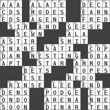 ACROSS 1. American Automobile Association (abbr.) 4. Having winglike extensions 9. Tenth: prefix 13. Music discs 14. Methods 15. Merit 16. Begley and Asner 17. Rep 18. Flintstone 19. Title for a knight 21. Plus 22. Honkers 24. Stitched 26. Chicken ___ king 27. Moving about 29. Stricken, poetically 30. Empty; void 31. Suttee (variant) 33. Police officer (slang) 36. One of the 12 tribes of Israel 37. Inhabiting a nest 40. Chief or king in Benin or Nigeria 41. Fitting 42. Play the lead 43. ID or VA city 45. Wagers 47. Drinks excessively 48. Compass dir. 49. Redecorate 50. Remove soap 52. Area sheltered from the wind 54. Conclusion 56. Cub Scout units 57. Plash 59. Sight organ 61. Southwest Nigerian state 62. Sports stadium 63. Compass dir. 64. Within a short period 65. Middle Eastern gold or silver currency 66. Nine, plus one DOWN 1. Adept person 2. Does sums 3. Helper 4. Nanny (var.) 5. Utah city north of Ogden 6. An important port of Yemen 7. Be inclined (to) 8. Eastern Standard Time (abbr.) 9. Outscore 10. Hearing organs 11. Algonquian 12. Indiana (abbr.) 20. It's straight from the horse's mouth 22. Street urchin 23. Biblical high priest 25. Songbird 27. Opera by Verdi 28. Fastener 29. Use a swizzle stick 31. Fast planes 32. _ moment's notice (2 wds.) 33. Part 34. Mitch Miller's instrument 35. Baking dishes 38. First name in cosmetics 39. Yard entry 44. Method 45. Gillaume's butler role 46. Curvy letter 49. Rain (Swedish) 50. Former U.S. Attorney General Janet 51. Southeast Asian peninsula 52. Australian parrot (variant) 53. Paradise 55. Centimeter-gram-second unit of force 56. Two (Sp.) 57. Writing tablet 58. Hearing organ 60. Car or cant ending