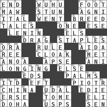 ACROSS 1. Conclude 4. Chinese city south-southwest of Nanjing 8. Pick up the tab 12. Opening into something insatiable 13. Astound 14. Hindu god of fire 15. Slanted text style (abbr.) 17. Gone 18. A special lineage 19. Lies 21. Single 23. Compass dir. 24. Soviet premier 1918-24 26. Raised railways 28. To draw with force 30. Paper fasteners 34. Mouth or opening 37. General guideline 39. Opera by Verdi 40. To separate or throw off 41. Loose outer garment 43. Was introduced to 44. Small Philippine buffalo 46. Domed church section 47. Black tropical American cuckoo 48. Yearning 51. Otherwise 54. Begley and Asner 55. Insides of hands 58. It would 61. Bank Draft (abbr.) 63. Peter (Polish) 65. Large country 67. Hereditary estate 71. Singer Brickell 72. Celtic language 73. Heavy book 74. Biblical high priest 75. Capital of the state of Qatar 76. United States Postal Service (abbr.) 77. Elected rep. DOWN 1. Give off 2. Relating to or accompanying birth 3. A sleeping potion; an opiate (poet.) 4. Compass dir. 5. Shoshoni 6. Attila the _ 7. To (old English) 8. At a great distance 9. Double curve, resembling the letter S 10. Washington bills 11. Periodic rise and fall of the sea level 16. Grant temporary use of 18. Actor Lugosi 20. Title for a knight 22. Fish or hair follower 25. Drug cop 27. Health resort 29. Russian prison camp 30. Gospel singer Marvin 31. Pale green bean 32. Genesis locale 33. Suttee (variant) 34. Relating to the mouth 35. Western Nevada city 36. Age 38. Trim (branches) 42. Seaweed 45. Grow older 49. The main thing one is thinking about 50. Overdraft (abbr.) 52. Plant excrement 53. Writer Wiesel 56. Methods 57. Vertical member of a panel or frame 58. On the rocks 59. Through, poetically 60. Food container 62. Ballerina skirt 64. It's straight from the horse's mouth 66. Teachers' org. 68. Two (Sp.) 69. Electrical Unit 70. French article